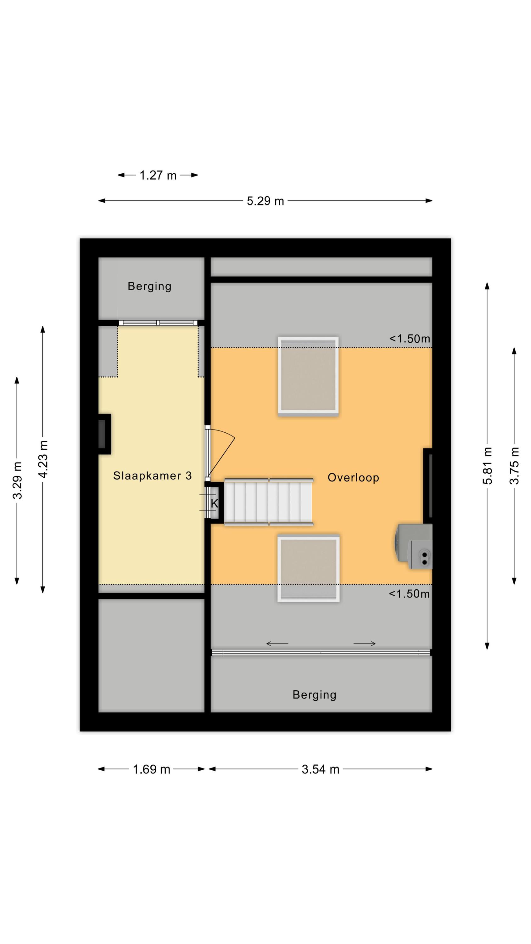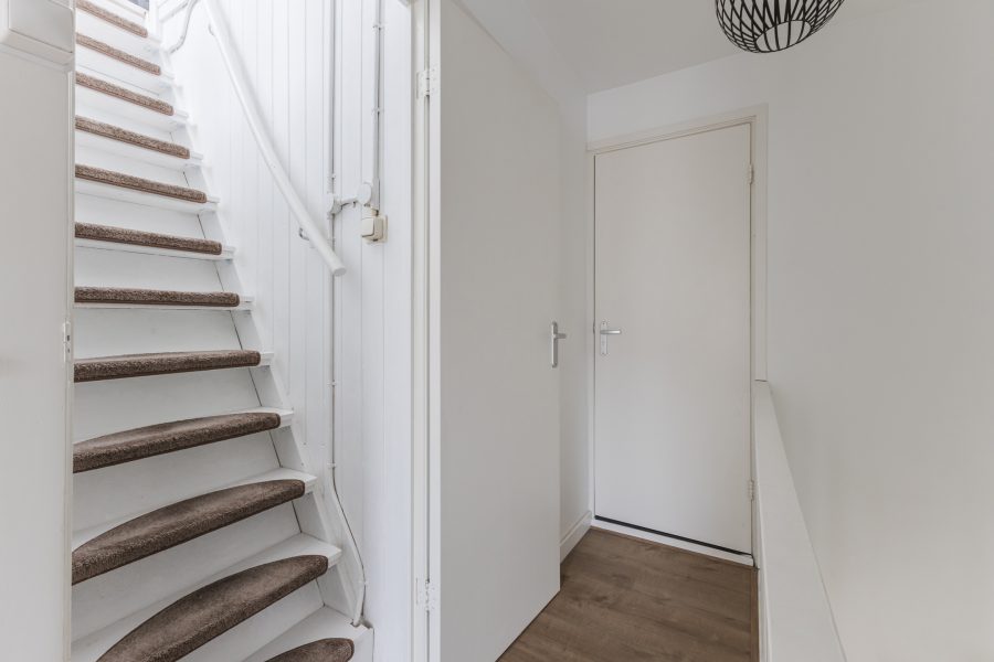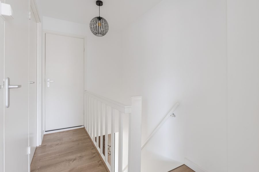 Via de trap kom je op de ruime overloop van de tweede verdieping. Hier bevinden zich de cv-installatie en aansluitingen voor de wasmachine en droger. Verder heb je hier volop ruimte om spullen op te bergen. De overloop biedt toegang tot bergingen en de derde slaapkamer.