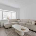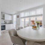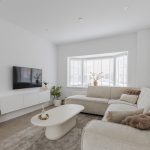 The spacious living room has modern tiled flooring and sleek walls. The bay window at the front and the garden doors at the back provide pleasant natural light. The living room is also lit by recessed spotlights.