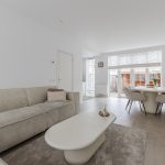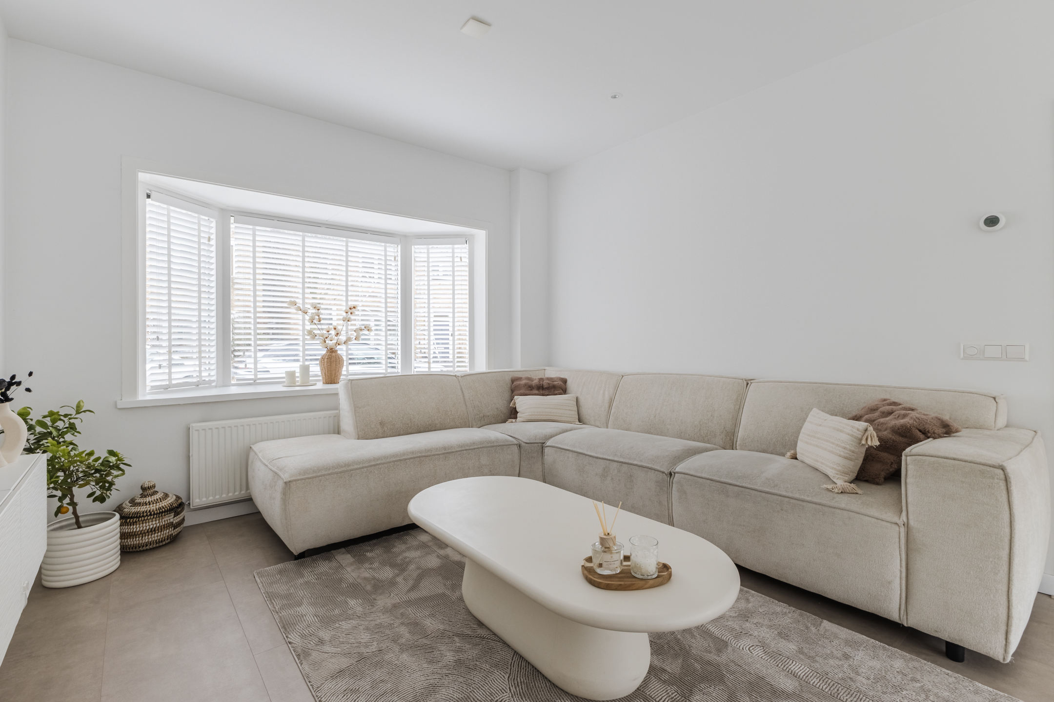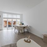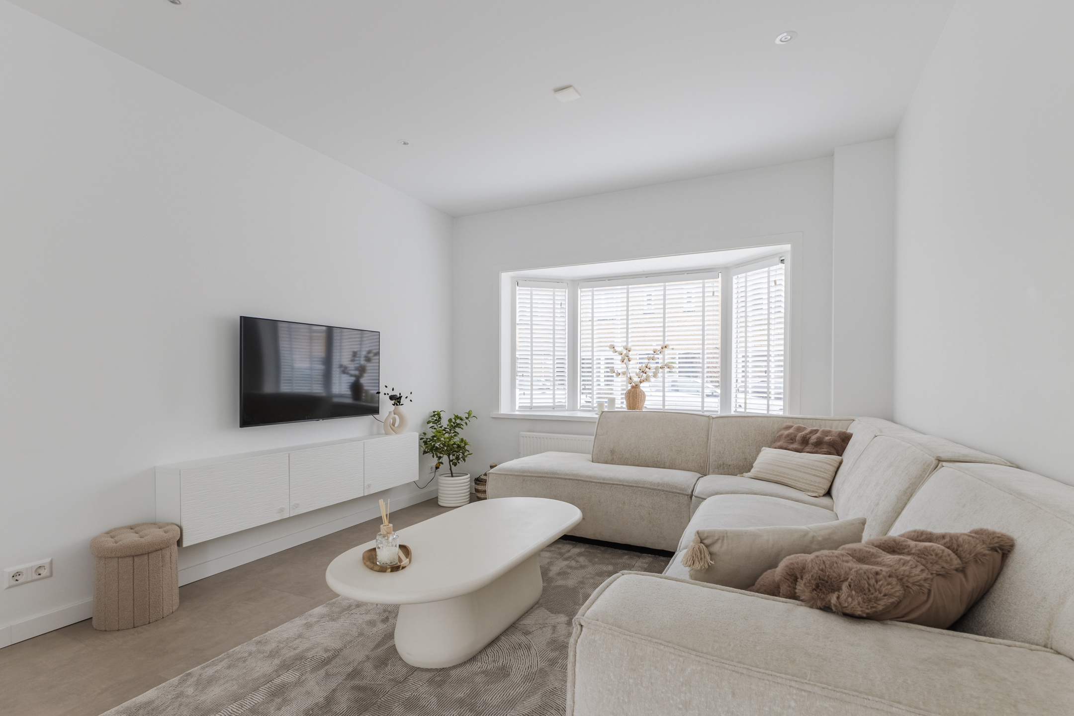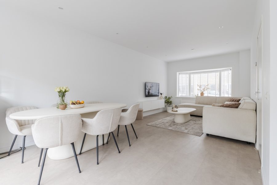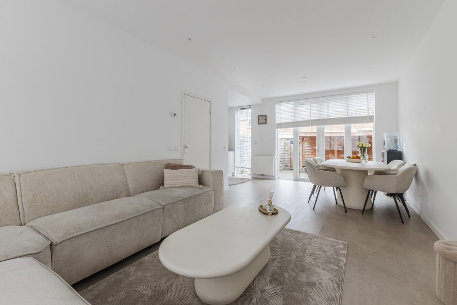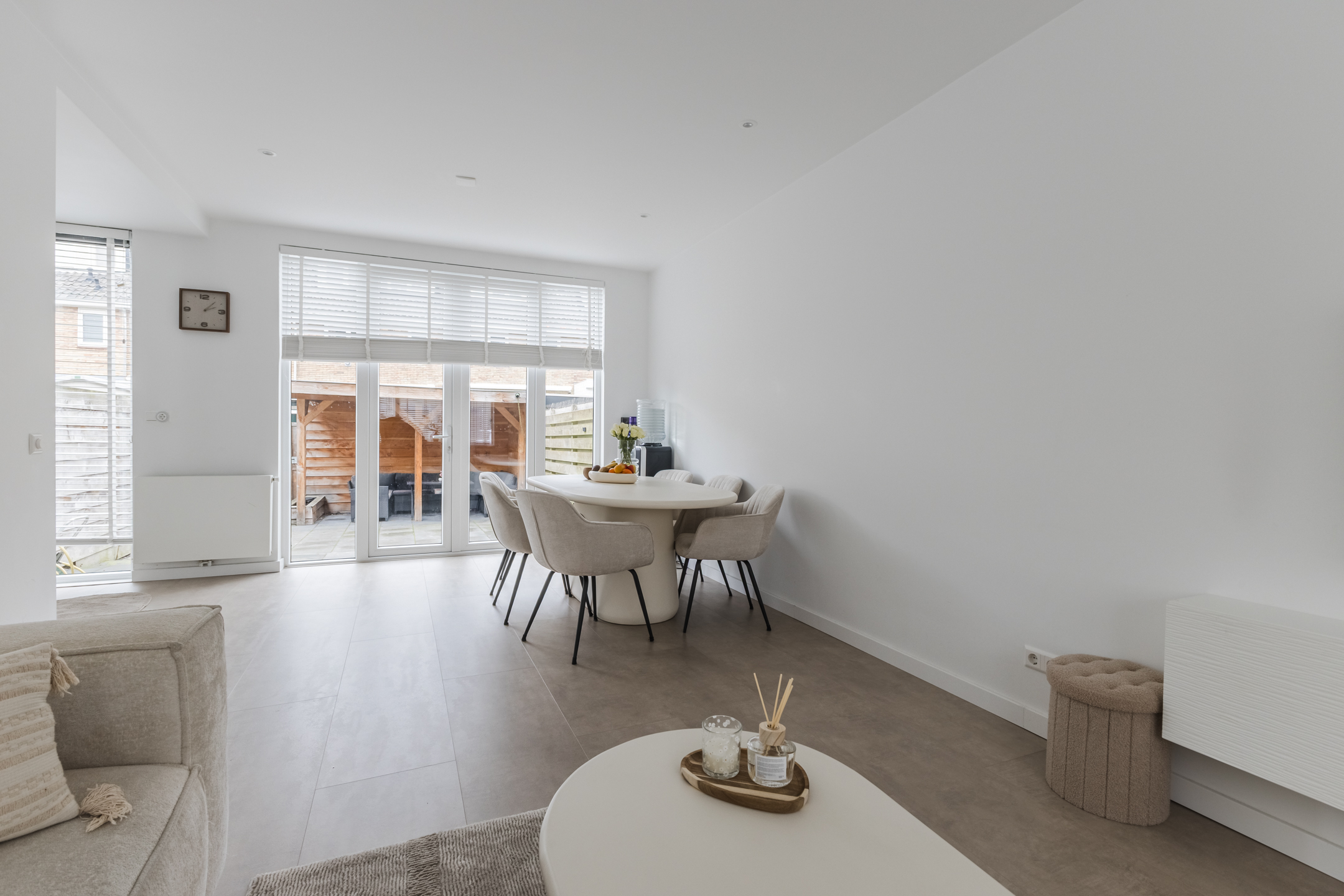 De ruime woonkamer is voorzien van een moderne tegelvloer en strak afgewerkte wanden. Het erkerraam aan de voorzijde en de openslaande tuindeuren aan de achterzijde zorgen samen voor een prettige lichtinval. Verder wordt de woonkamer verlicht met inbouwspots.