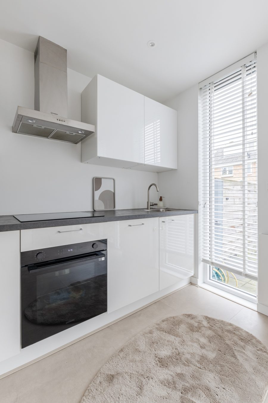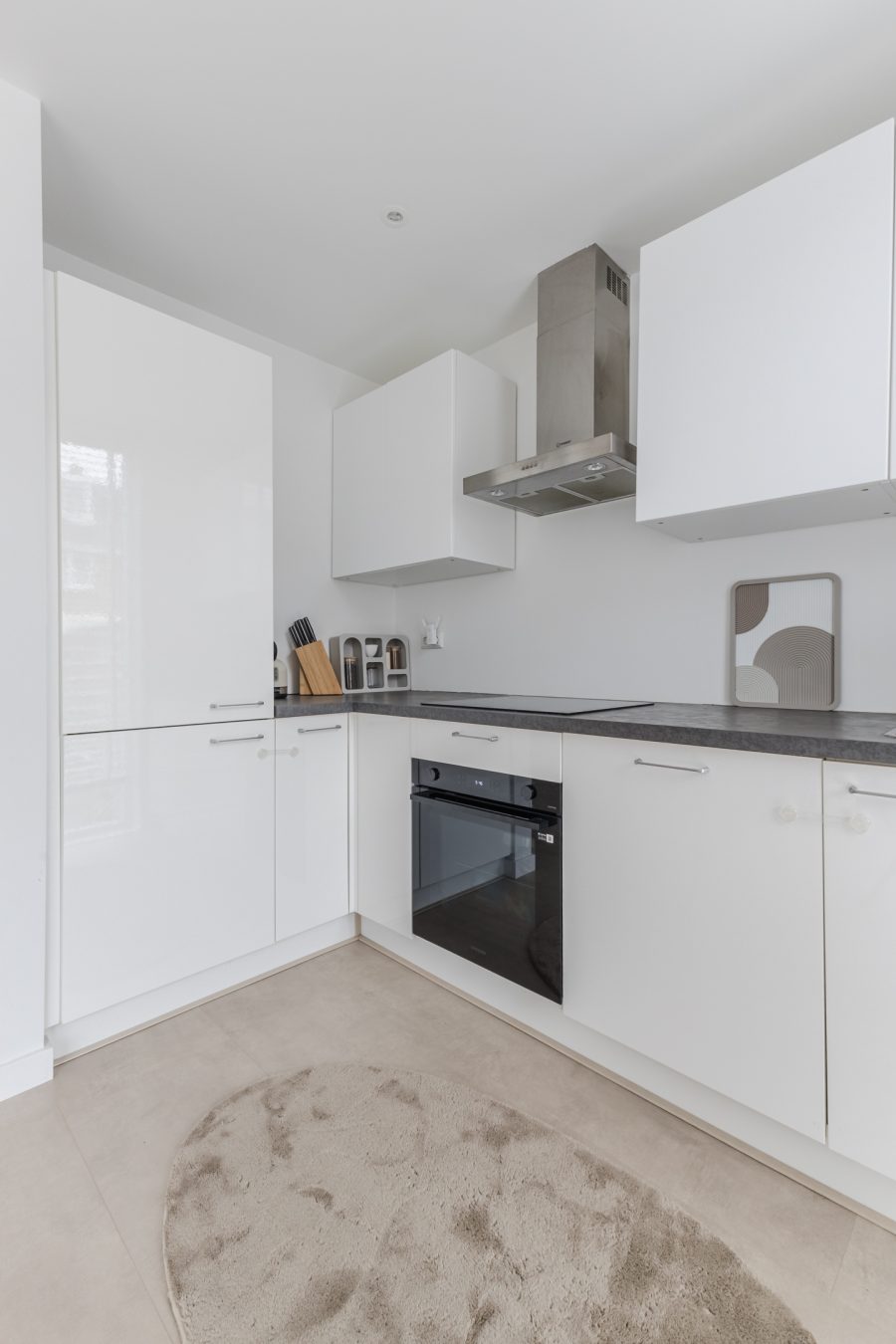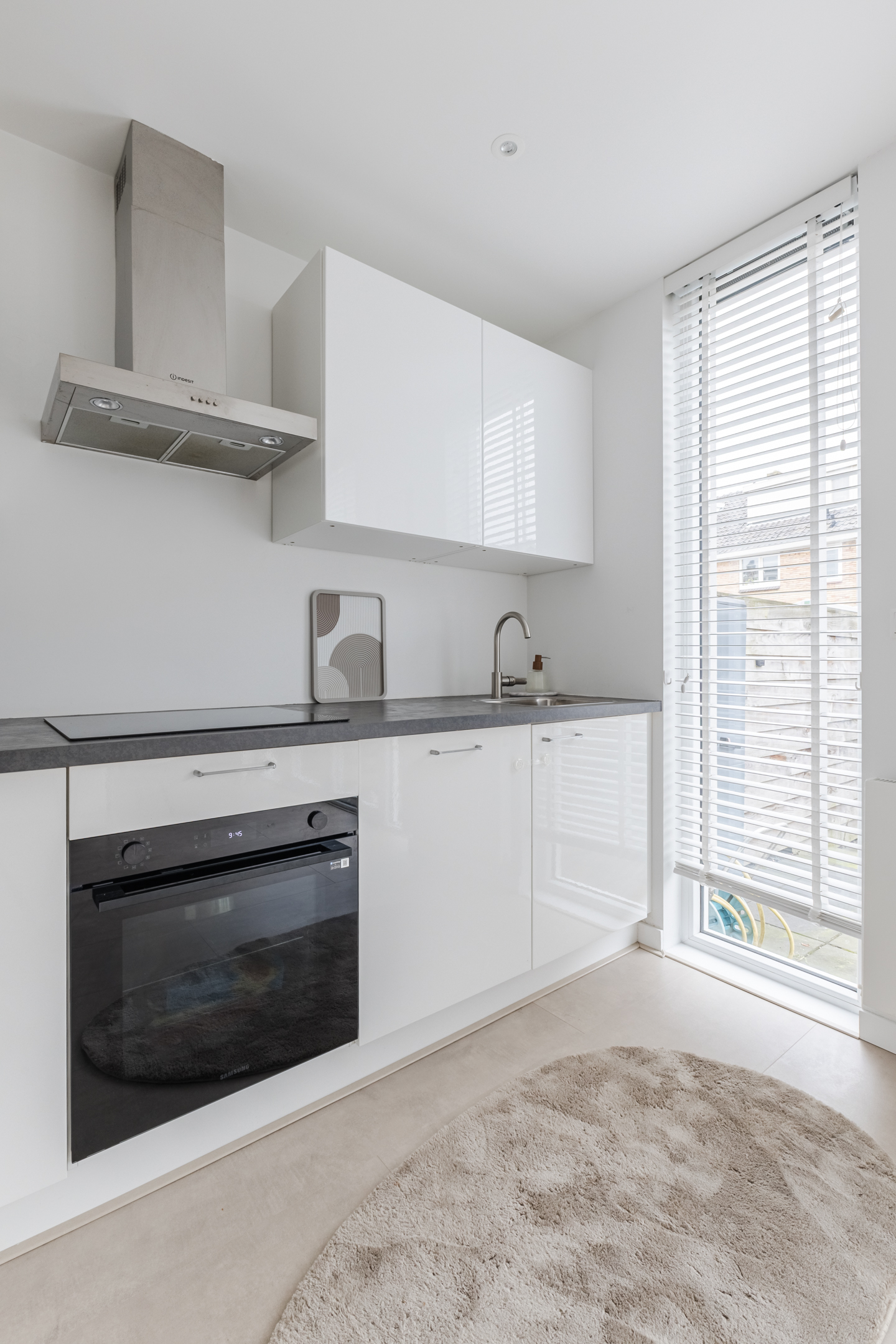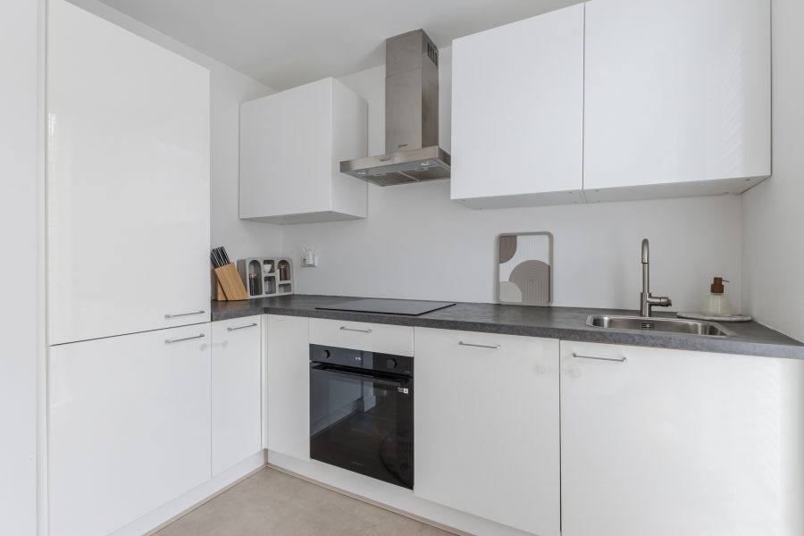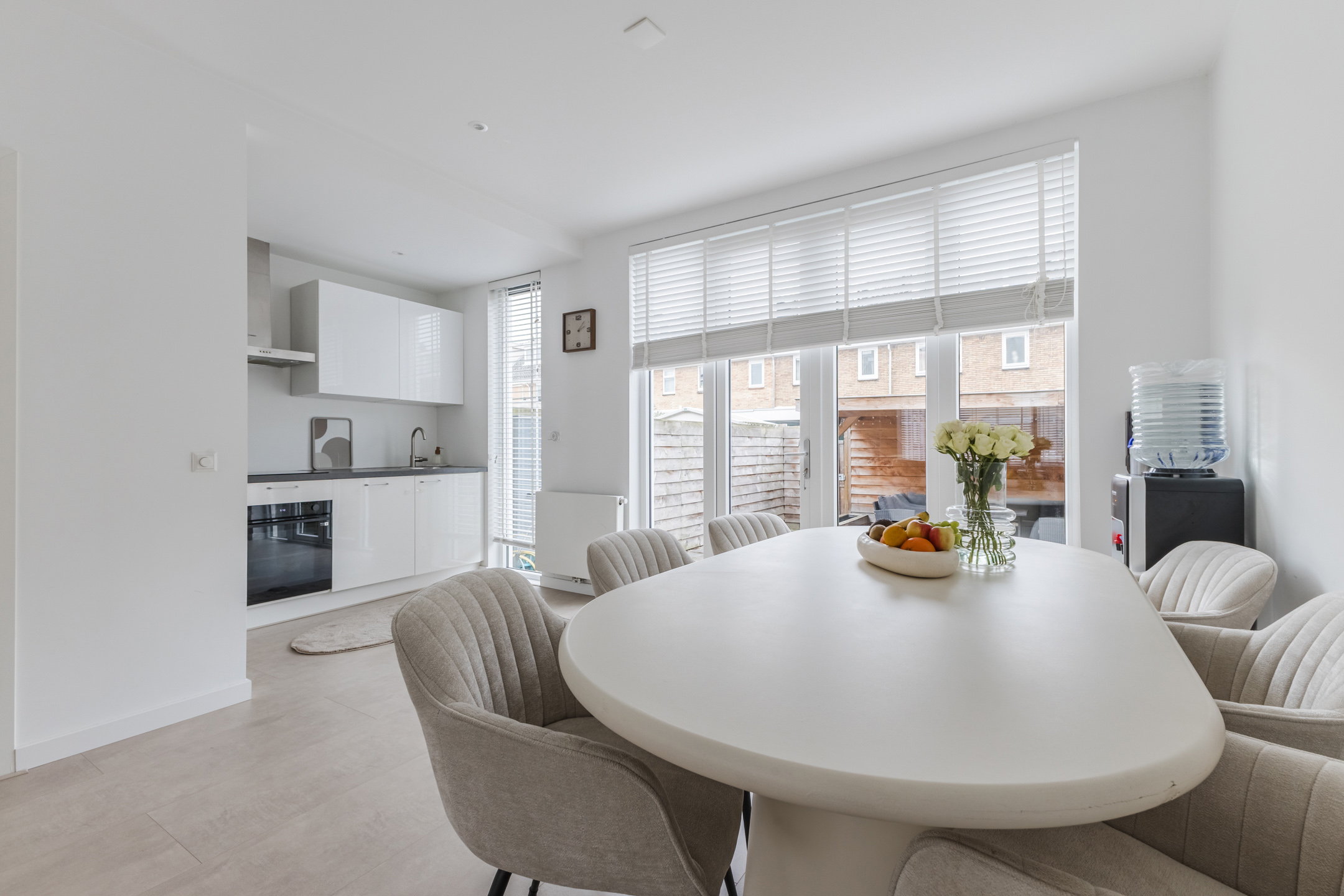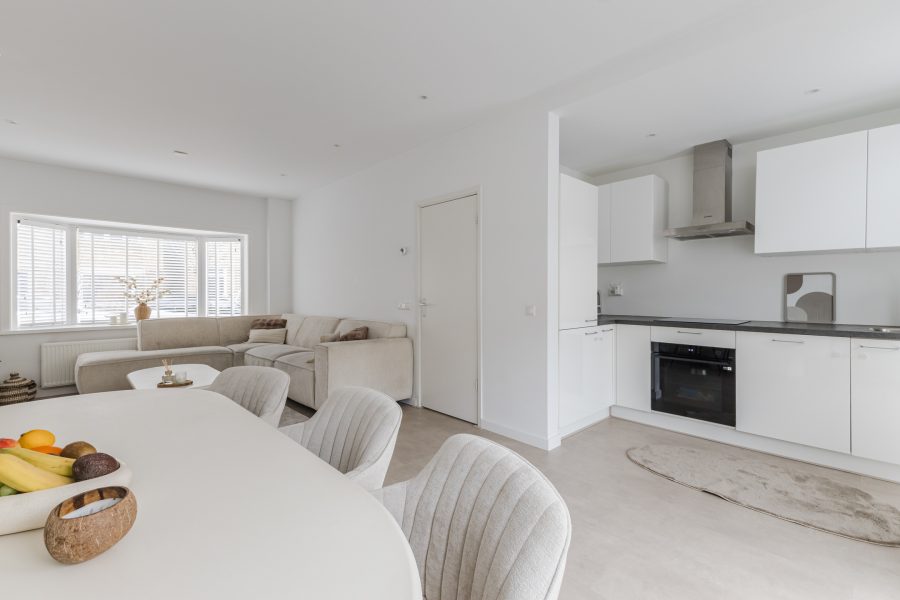 Aan de achterzijde bevindt zich de open keuken. Deze is vernieuwd in 2021 en uitgevoerd in een hoekopstelling. De keuken heeft een strak design met witte kastjes en een donker werkblad. Hier tref je de volgende apparatuur aan: vaatwasser, inductie fornuis, afzuigkap, oven, koelkast en vriezer.