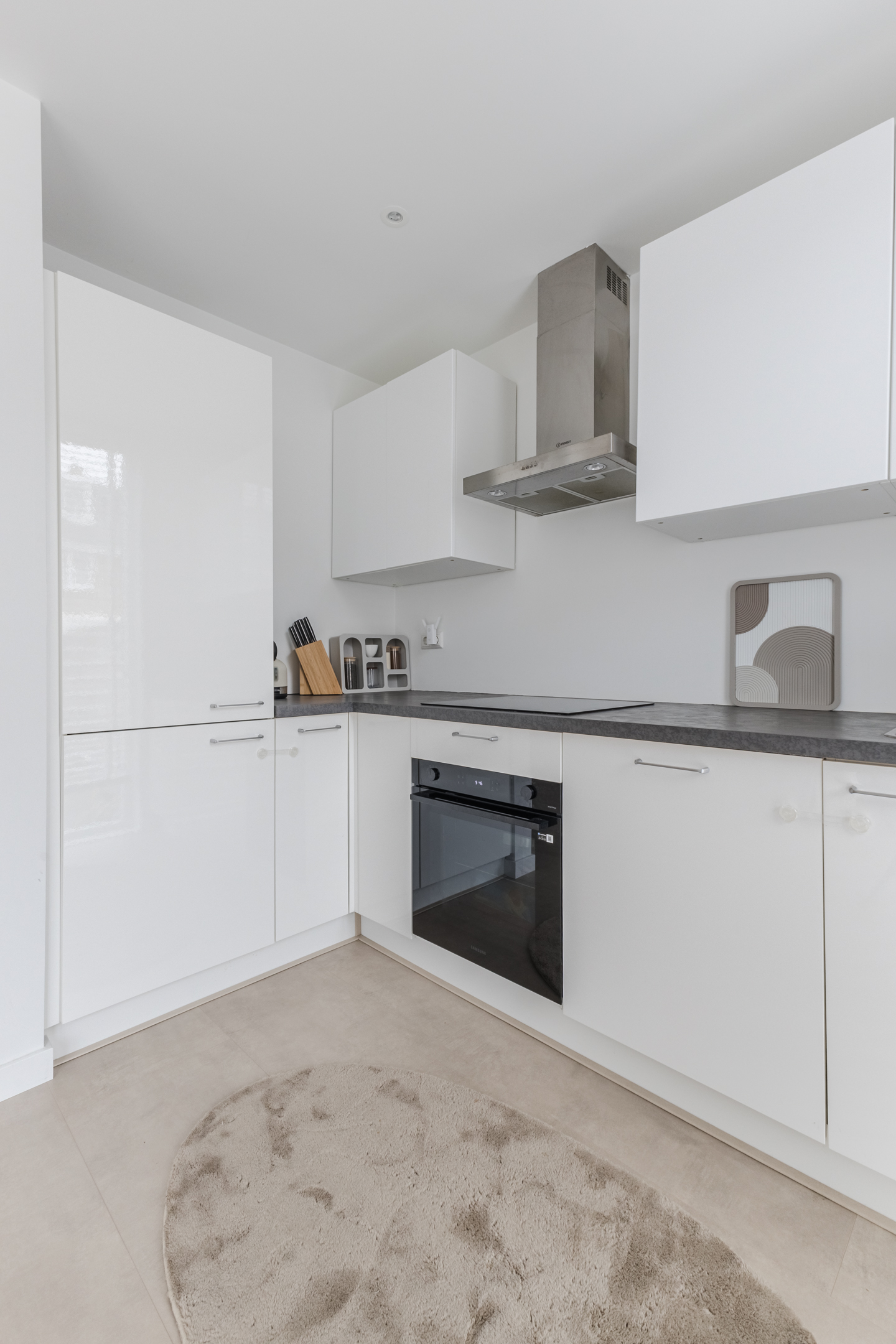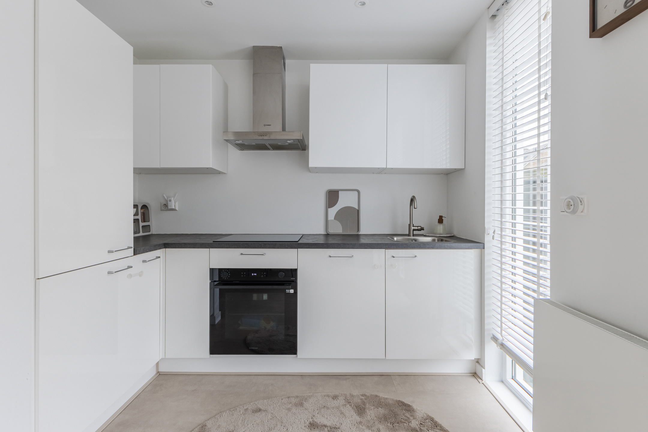 You will find the open kitchen at the back. It was renovated in 2021 and has a corner layout. The kitchen has a sleek design with white cabinets and a dark countertop. It is equipped with the following appliances: dishwasher, induction stove, extractor hood, oven, refrigerator and freezer.