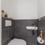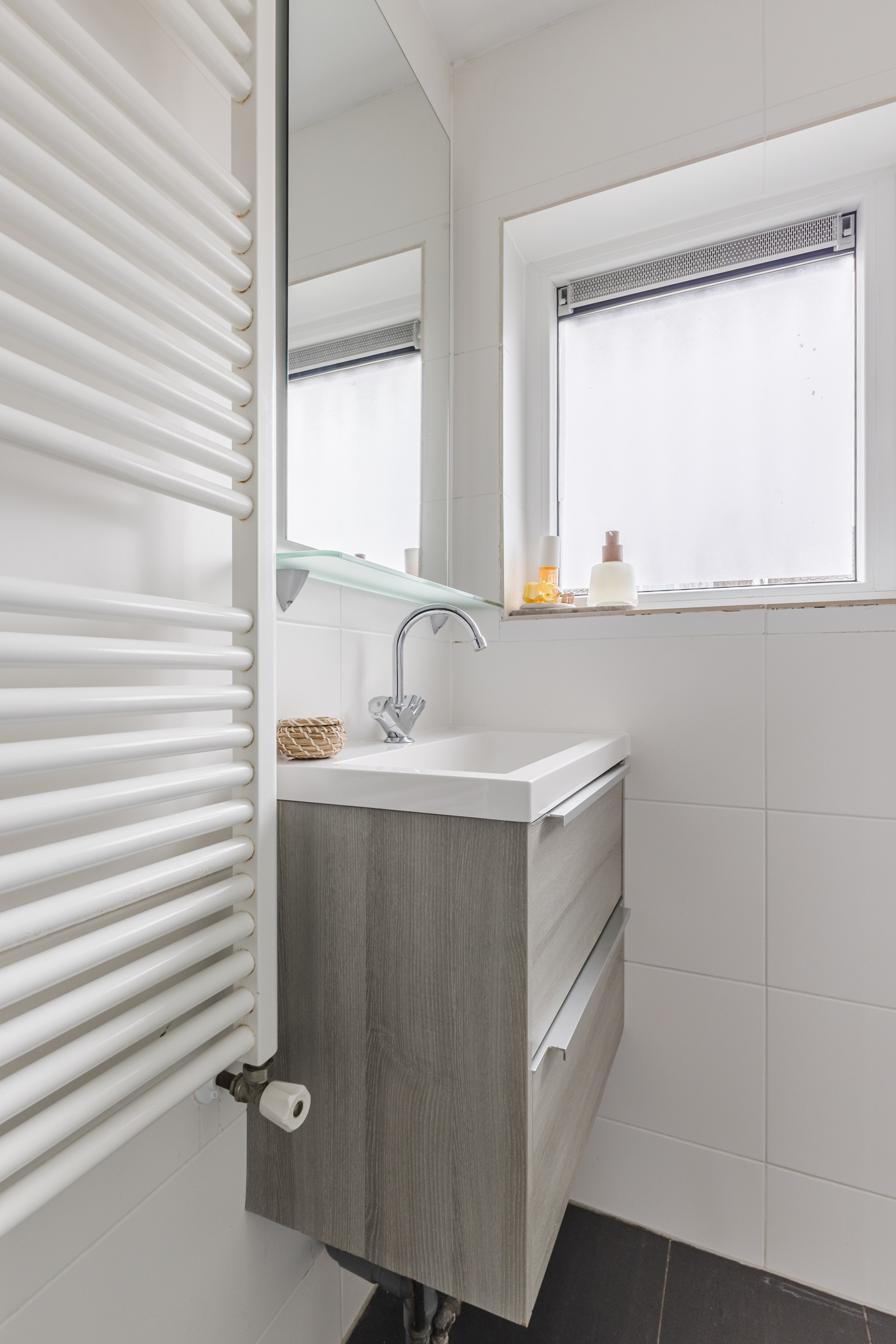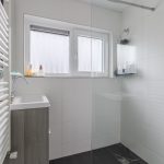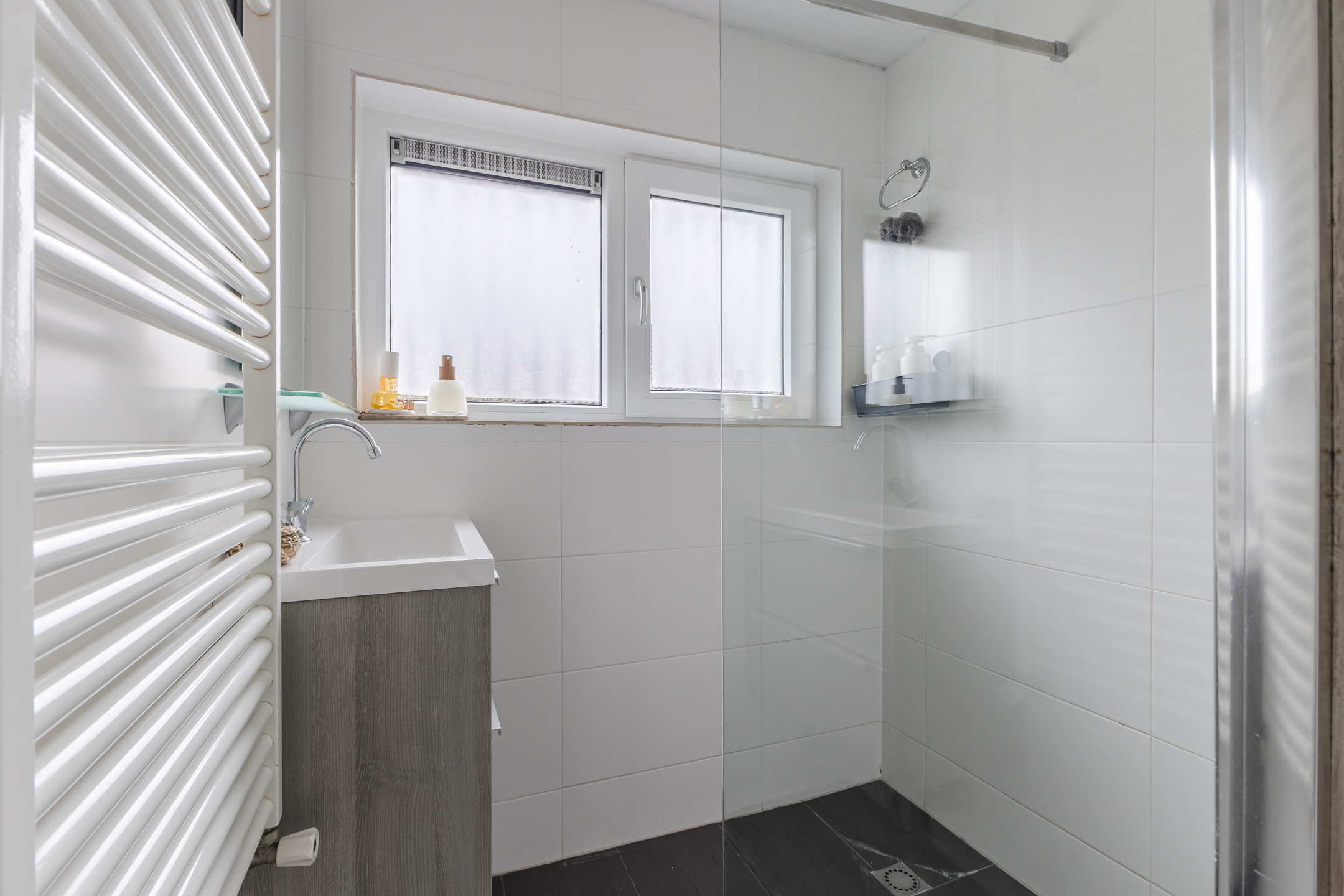 De badkamer (2021) is afgewerkt met donkere vloertegels en witte wandtegels. Hier vind je een badmeubel met wastafel, designradiator en een inloopdouche.