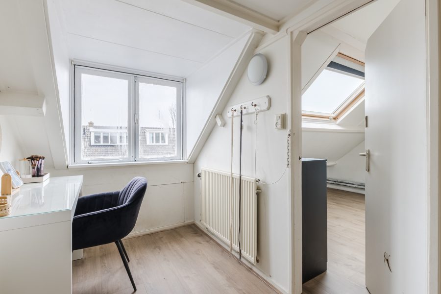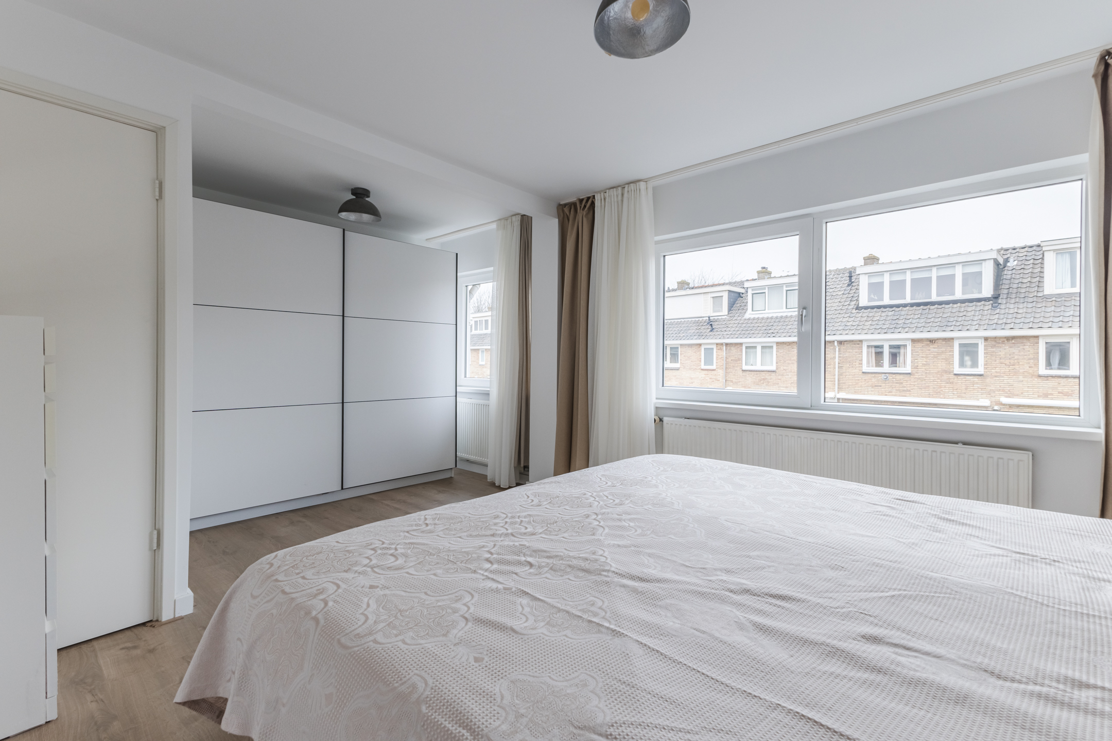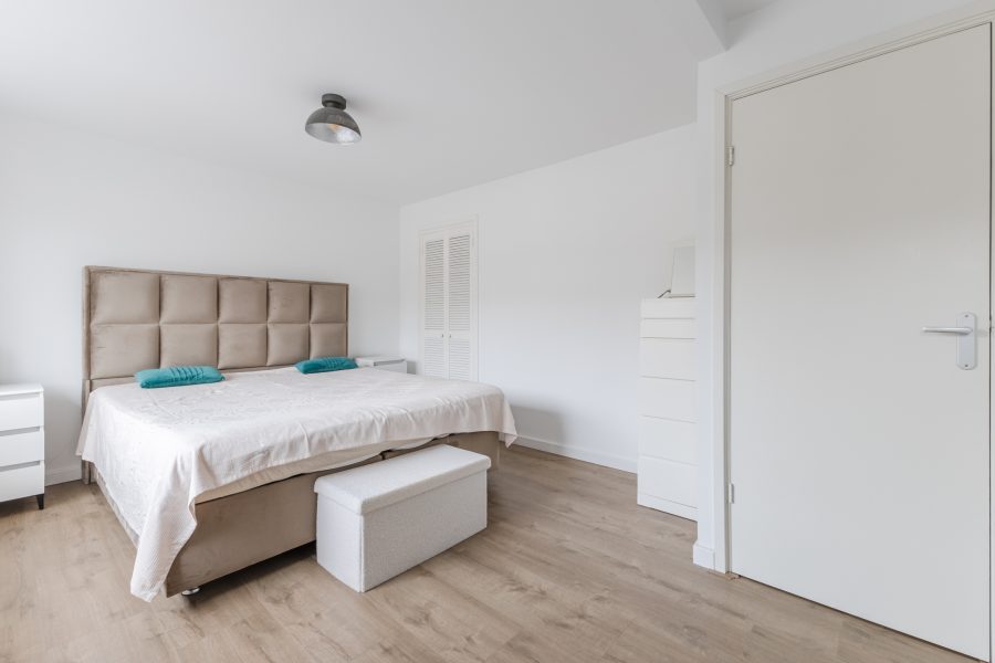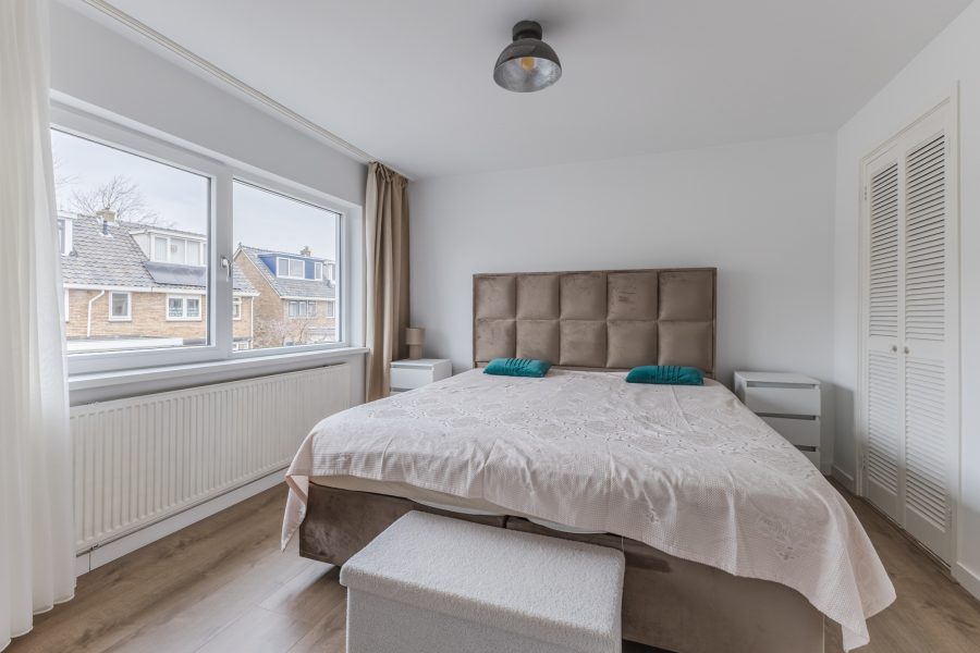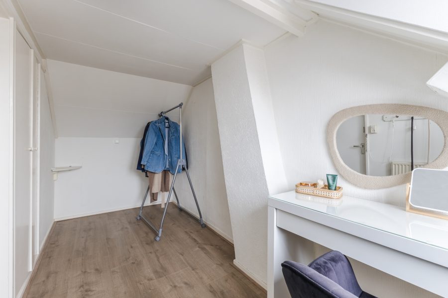 De slaapkamer is netjes afgewerkt en geniet van veel licht dankzij de dakkapel aan de achterzijde. In de kamer is bergruimte gecreëerd.