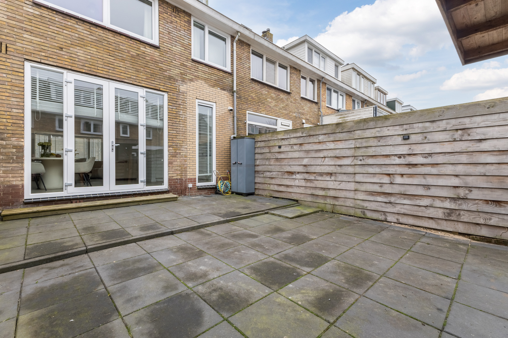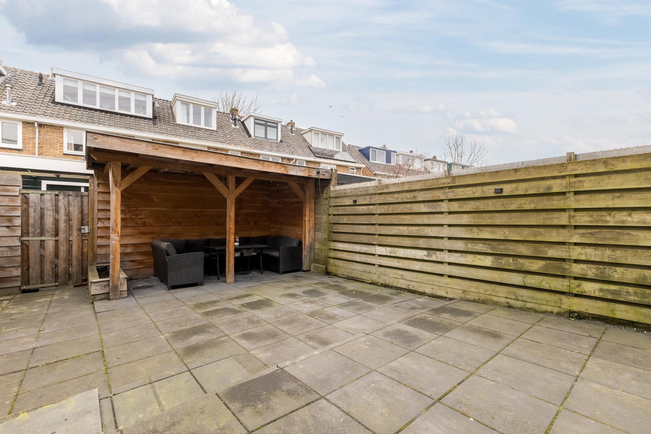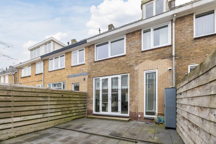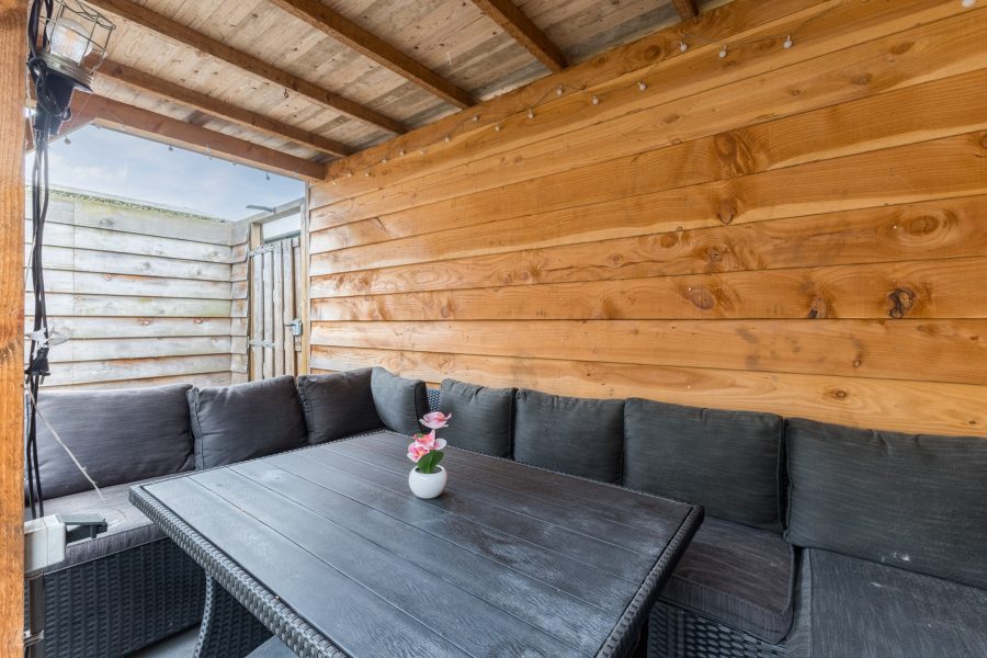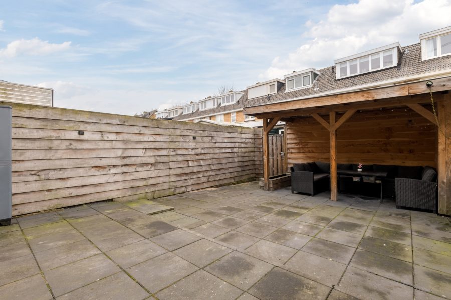 Het huis beschikt over een grote, betegelde achtertuin (24 m²). Er is genoeg ruimte voor meerdere gezellige zitjes en/of speeltoestellen voor kinderen. De tuin ligt op het noordwesten en biedt middag- en avondzon. Dankzij de houten schuttingen aan beide kanten ervaar je volop privacy. Achterin de tuin staat een grote houten overkapping, ideaal om overdekt te loungen. De tuin is bereikbaar via een achterom.