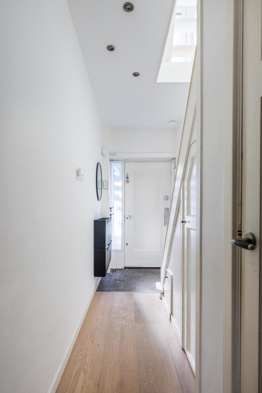 Via de voortuin bereiken we de voordeur met zijlichten. Entree met garderobe en meterkast, brede vaste kast. Zwevend toilet met fonteintje en toegang tot de ruime, lichte woonkamer met open keuken. De woonkamer heeft een hoog plafond, aan de voorzijde een erker en aan de achterzijde openslaande deuren naar de tuin. Aan de achterzijde bevindt zich de L-vormige keuken. De keuken heeft witte fronten en is voorzien van inbouwapparatuur, o.a. een inductiekookplaat (2023). Ter hoogte van de keuken bevindt zich een prachtige vaste kast. Er is ruimte genoeg in de woonkamer voor een royale zithoek en een ruime eettafel. Op de grond liggen houten vloerdelen met eronder vloerverwarming en de muren en plafonds zijn strak en neutraal afgewerkt.