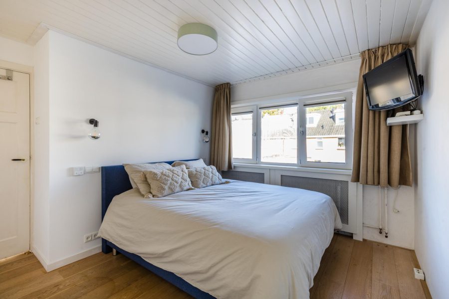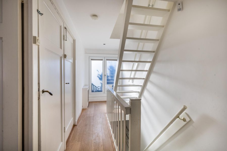 Via the staircase in the hall, you reach the landing of this floor. The landing has an attractive French balcony at the front. Two bedrooms and the bathroom can be found here. One bedroom is at the back, next to the bathroom, and the second bedroom is at the front. Both bedrooms have fitted wardrobes and the panel doors have been retained. In the attractive contemporary bathroom you will find a large walk-in shower with handheld and rain shower, a vanity unit with washbasin and mirror cabinet, a floating toilet, a design radiator and a bathtub. Also on this floor are wooden floorboards. The bathroom has underfloor heating.
