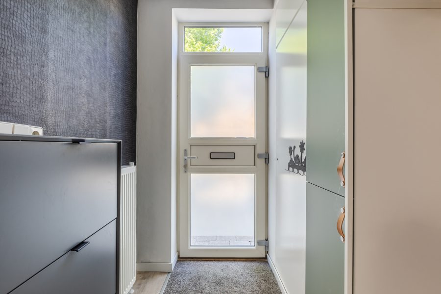Via de kleine, netjes verzorgde voortuin bereik je de voordeur van deze mooie woning. Na binnenkomst beland je eerst in een fraai afgewerkte entreehal met meterkast, garderobe, een toiletruimte met zwevend toilet en fonteintje, de trap naar de eerste verdieping en toegang tot de woonkamer.