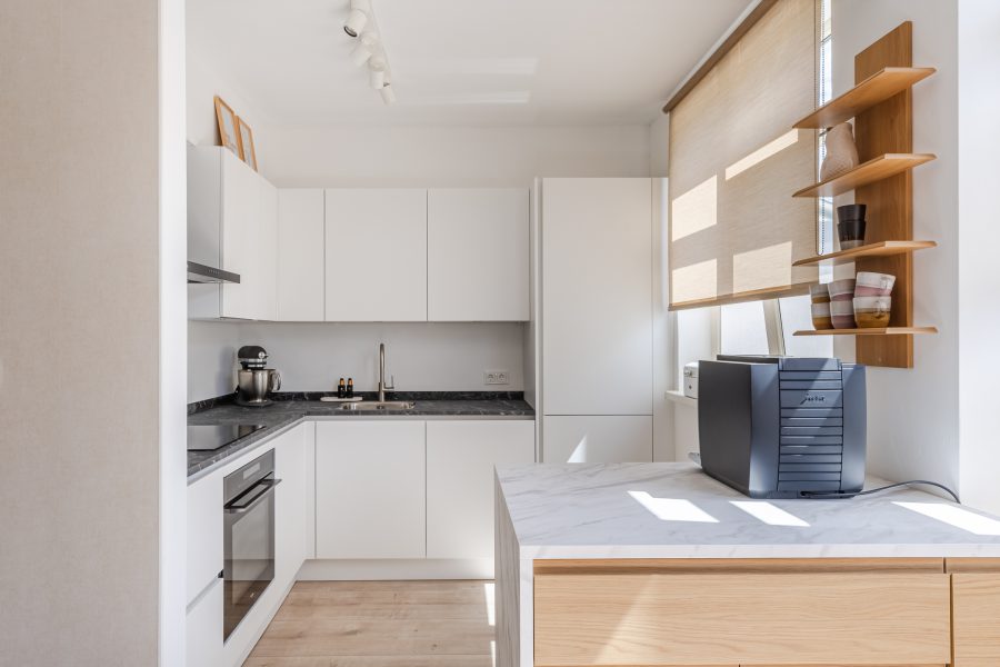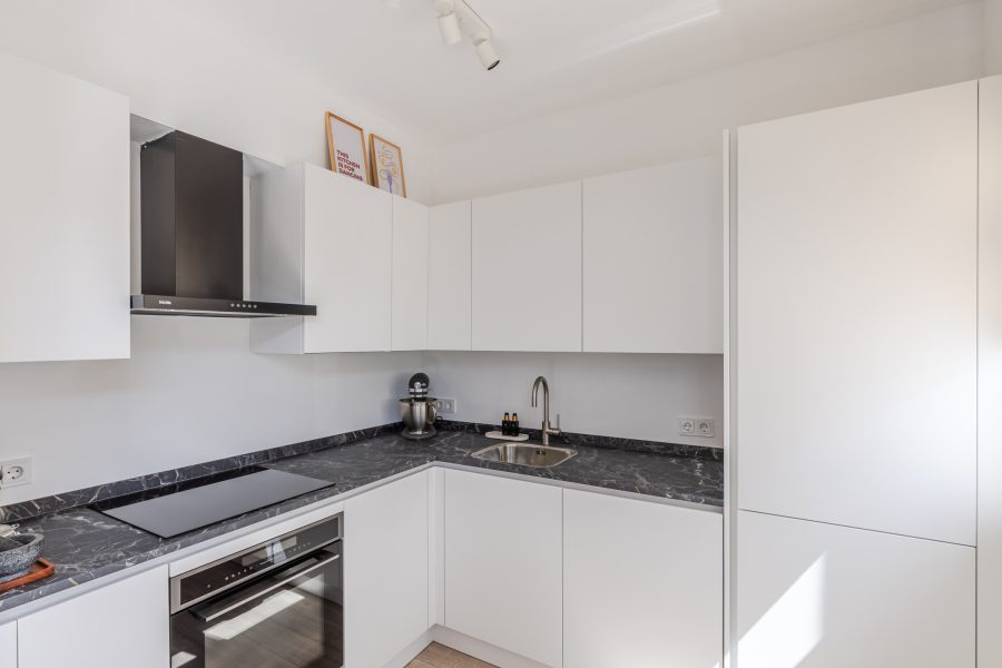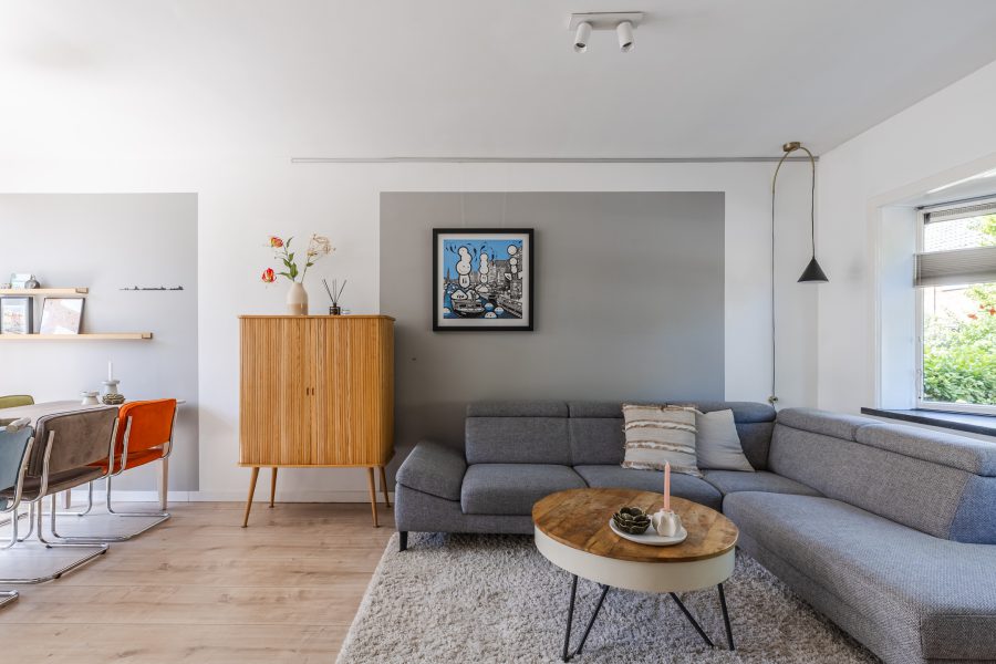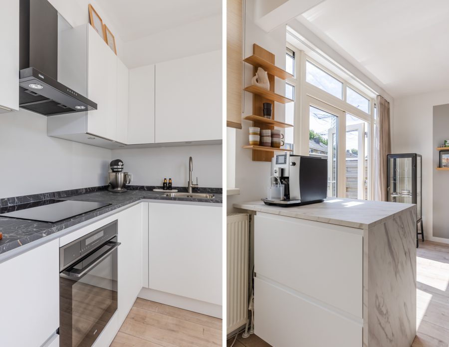 You will find the open kitchen at the back. This kitchen has a corner layout and a sleek design with white kitchen cabinets and a dark worktop. The kitchen was renovated in 2023 and is equipped with an induction hob, extractor hood, microwave-oven, refrigerator and freezer.