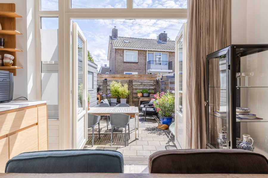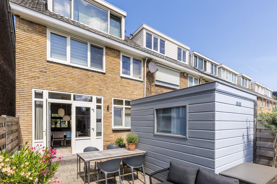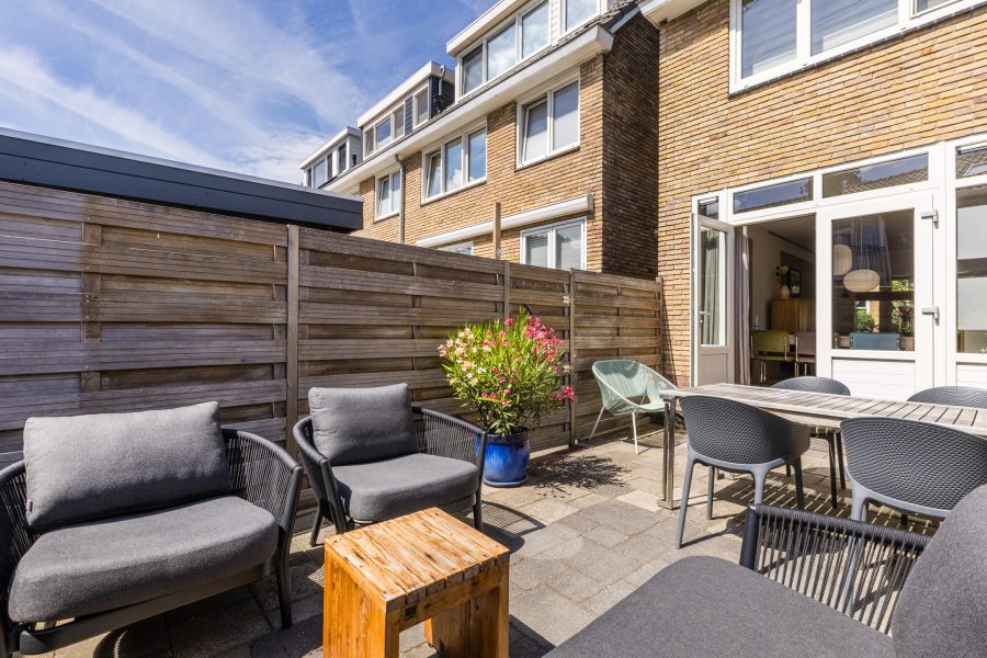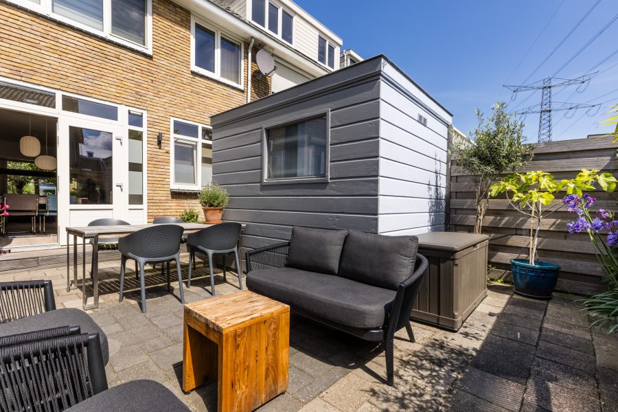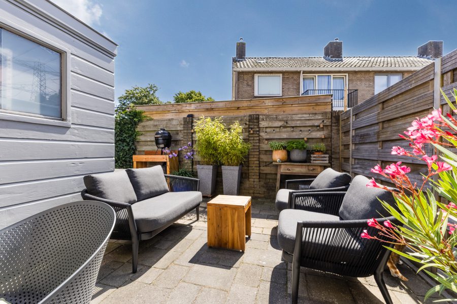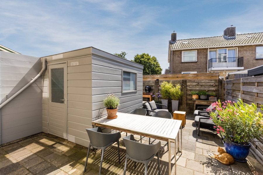 Het huis beschikt over een ruime en zonnige tuin op het zuidoosten. De tuin is keurig betegeld en biedt ruimte voor meerdere gezellige zitplekken. De houten schuttingen zorgen voor veel privacy. Door de gunstige ligging kun je tot ongeveer 19:00 uur ’s avonds genieten van de zon.