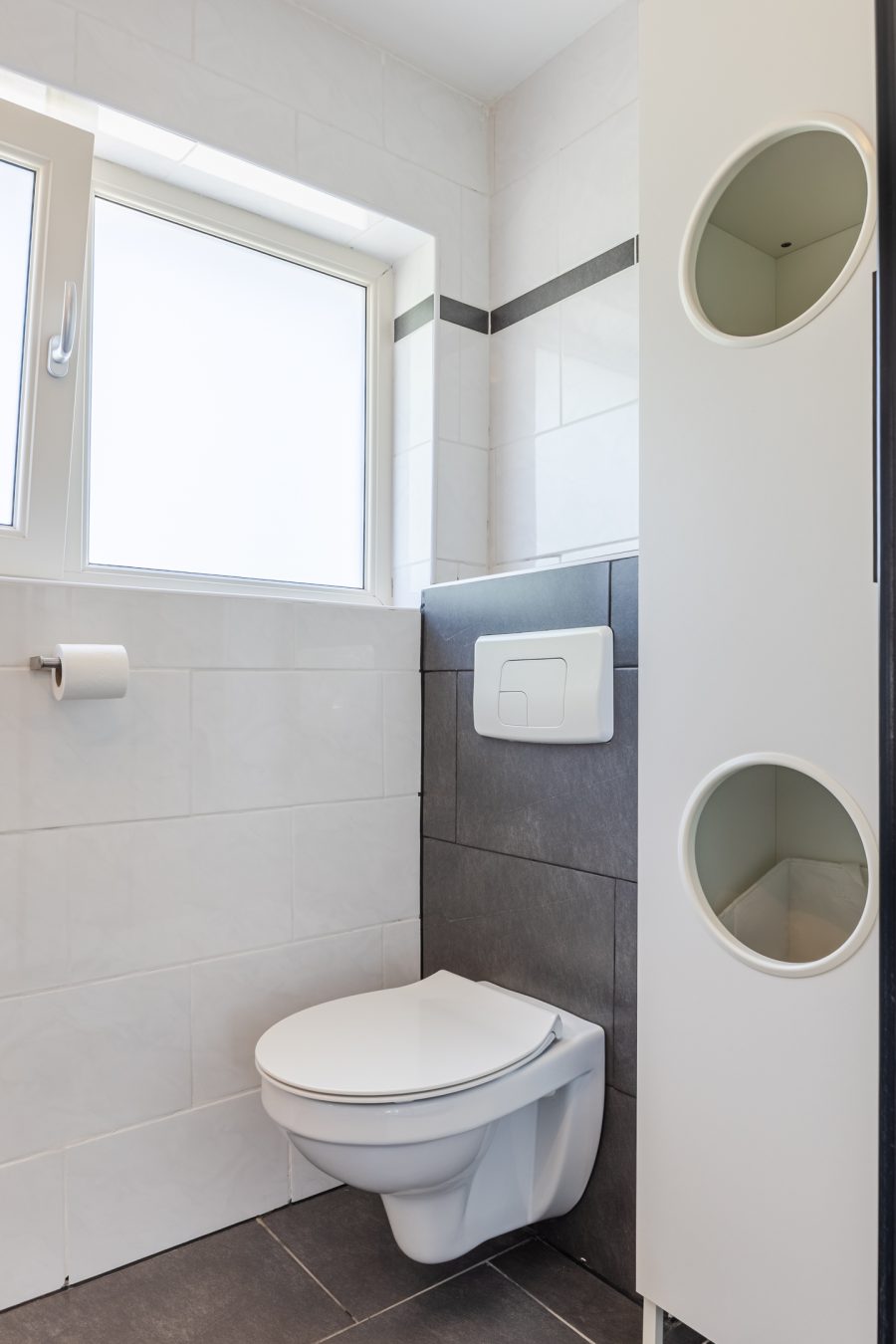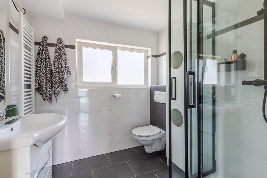 De ruime badkamer (2016) is uitgerust met een zwevend toilet, badmeubel met wastafel en douchecabine met regendouche.