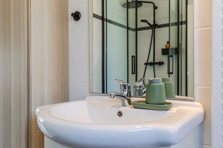 • Large and beautiful bathroom with toilet, sink and shower cabin