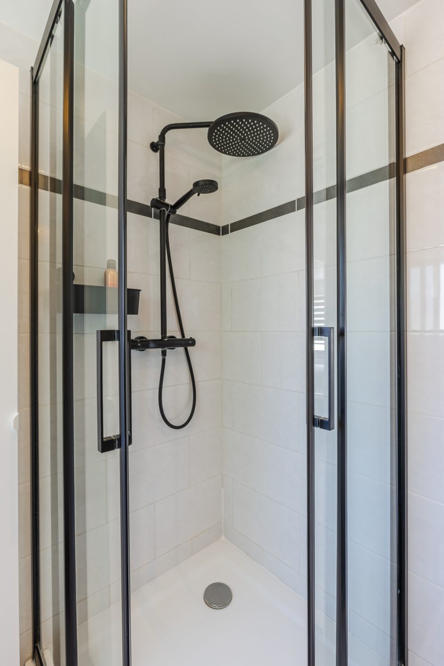 The spacious bathroom (2016) is beautifully finished in a combination of light and dark tiles. This room is equipped with a floating toilet, vanity unit with sink and shower cabin with rain shower.