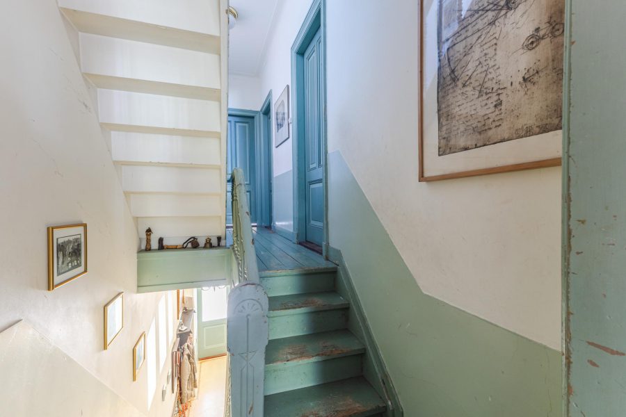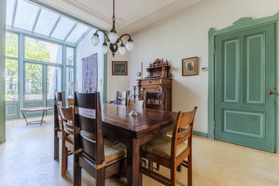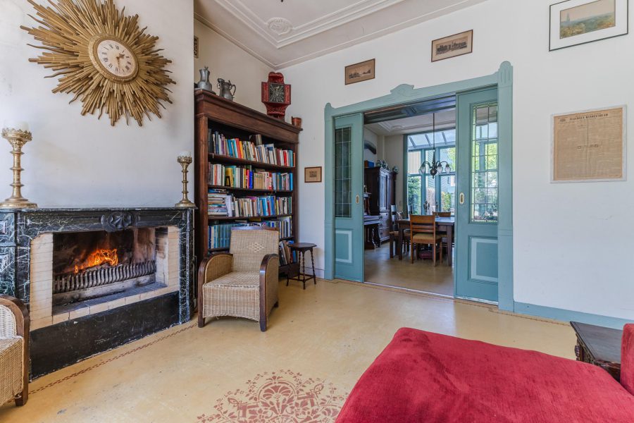 Through the largely paved front garden we reach the authentic front door. Entrance with marble floor and draft door to the hallway, Hallway with painted panelling, cloakroom, beautiful authentic staircase to the floors, access to the wine cellar, hand basin, floating toilet and access to the kitchen. The L-shaped kitchen has vanilla fronts, a marble countertop and a fireplace and is equipped with a six-burner gas cooker, a dishwasher and a fridge. The kitchen has an access door to the garden. Back in the hallway, we find the door to the living room. The spacious living room with fireplace has a bay window at the front. The room en suite turns into a dining room with an adjacent garden room with a beautiful high bay window with overhead lights and French doors to the garden. The dining room also has a fireplace. The rooms have high ceilings with mouldings. The ground floor has been fitted with underfloor heating since the new foundation. The flooring is provisional and has yet to be chosen by the new occupants.
