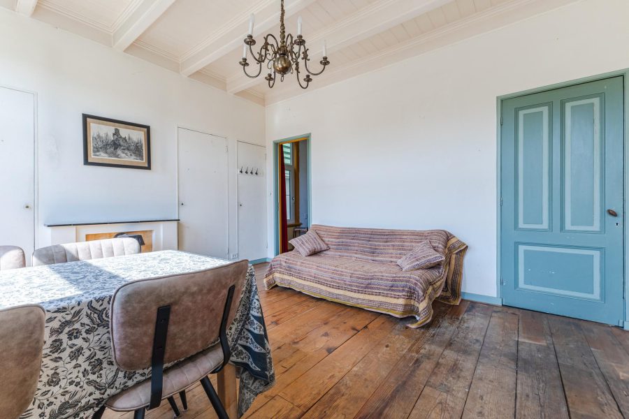 Via the staircase in the hall, you reach the first floor. This floor is also called the children's floor. This floor has front and back spacious bedrooms with an authentic feel. Between the bedrooms is a pantry. At the end of the hallway you will find the deep, attractive bathroom. The beautifully tiled, stylish bathroom has a vanity unit with sink and mirror, a freestanding bathtub, a toilet, a bidet, a design radiator and a double walk-in shower. On this floor, the ceiling beams are visible and, as throughout the house, the panel doors are retained. There are wooden floorboards. The room at the front features a fireplace with pot-bellied stove.
