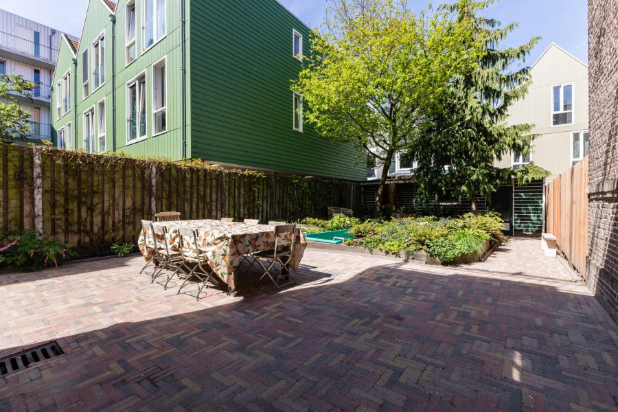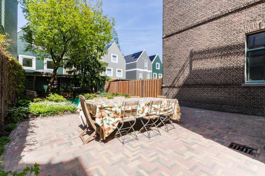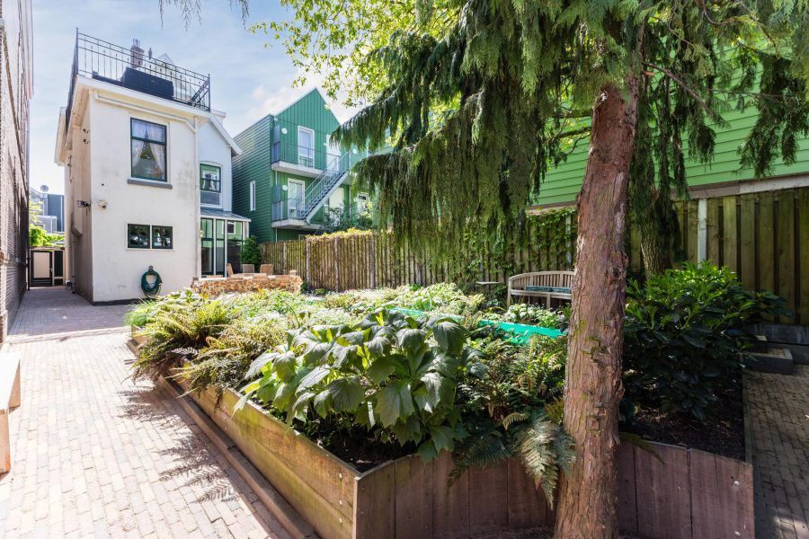 The property has a partly green, partly paved front garden with south-facing seating and a deep sheltered, partly paved and partly green back garden with a working pool among the greenery. The garden is large enough to create several nice lounge areas. At the back of the garden you will find a wooden shed with a canopy. There is a back entrance via the alley.