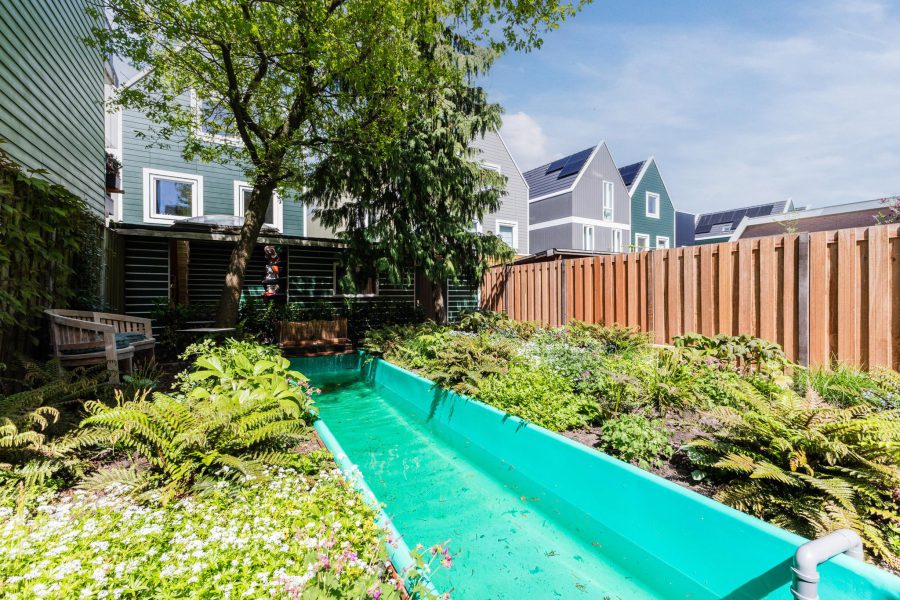 De woning heeft een deels groene, deel bestrate voortuin met zitje op het zuiden en een diepe beschutte, deels bestrate en deels groene achtertuin met een zwemvijver tussen het groen. De tuin is groot genoeg om een aantal fijne loungeplekken te realiseren. Achterin de tuin tref je een houten schuur aan met overkapping. Via de steeg is er een achterom.
