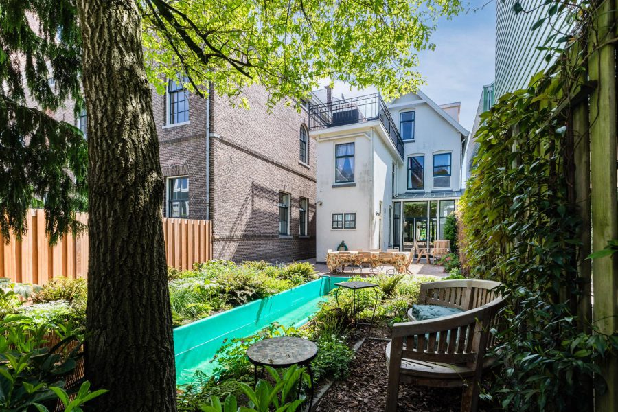 • Achtertuin met verschillende loungeplekken en zwemvijver