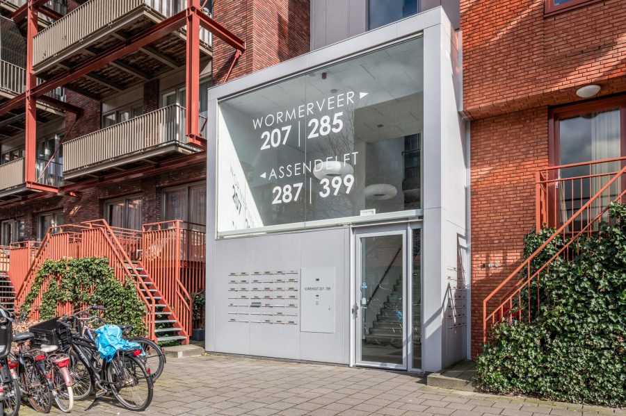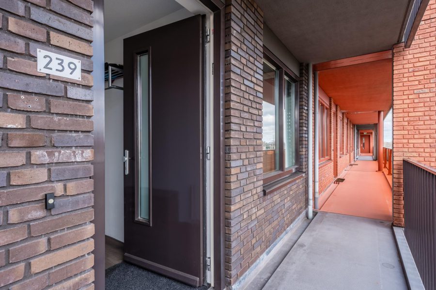 Gesloten entree met bel en intercom. Gemeenschappelijke hal met trappenhuis en lift. Met de trap of de lift bereik je de galerij op de derde verdieping en de voordeur van de woning.