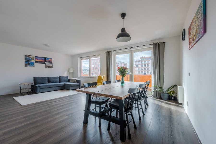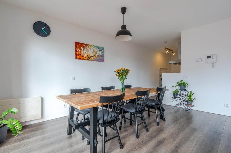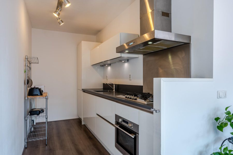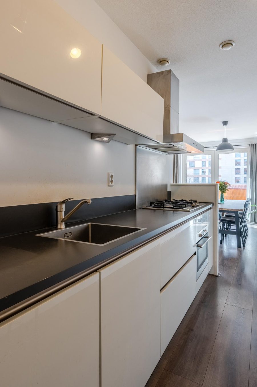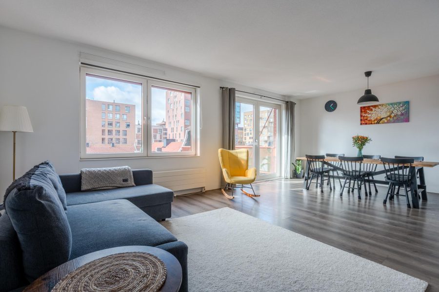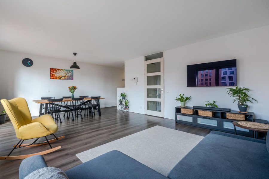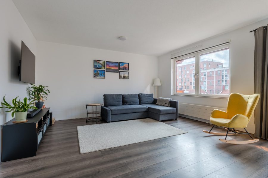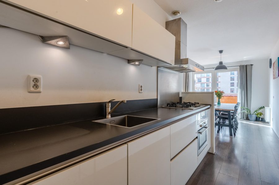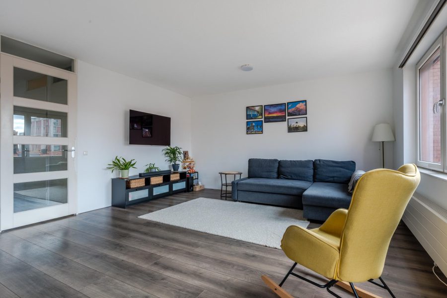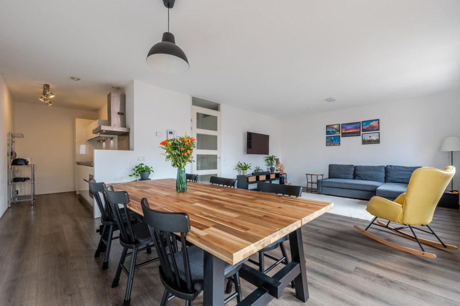 De ruime lichte woonkamer heeft aan de voorzijde een raampartij en naar binnendraaiende deuren naar een fijn balkon met een vrij uitzicht over een speelse Zaanse omgeving. Hier kun je een fijne loungeplek realiseren. De woonkamer is groot genoeg voor het plaatsen van een ruime zithoek en een zespersoons eettafel. Achterin de woonkamer tref je de rechte keuken aan met diverse inbouwapparatuur. In het appartement ligt een drempelloze houten vloer en de muren en plafonds zijn strak en neutraal afgewerkt.
