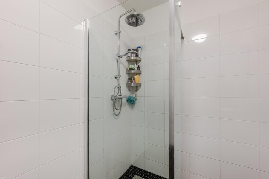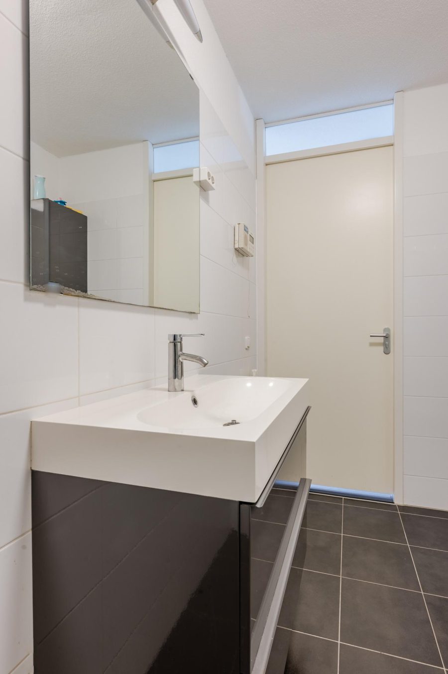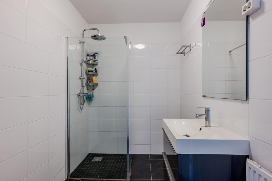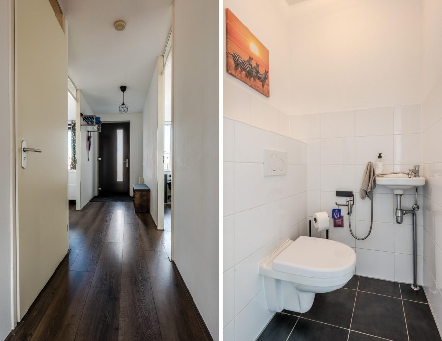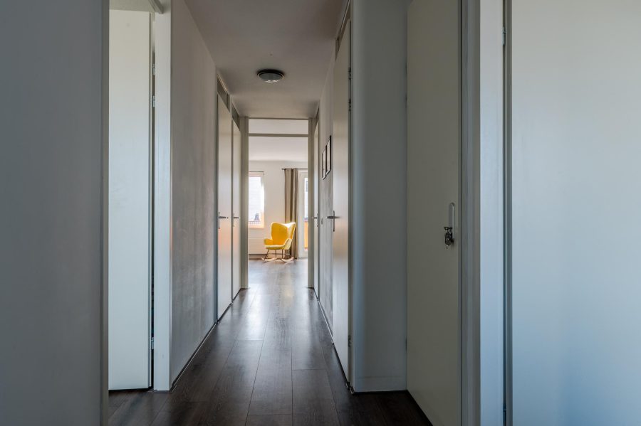 Entree met garderobe en meterkast en direct aan je linker- en je rechterhand vind je een slaapkamer. In de grootste slaapkamer is plaats voor een tweepersoonsbed en een werkplek. Verderop in de gang tref je het separate zwevende toilet met fonteintje aan, de badkamer, en twee inpandige bergingen. De badkamer is voorzien van een badmeubel met wastafel en spiegel en een inloopdouche met hand- en regendouche. In een van de bergingen tref je de aansluiting voor het witgoed aan en in de andere berging is de cv-installatie te vinden. Aan het eind van de gang is de toegangsdeur tot de woonkamer.