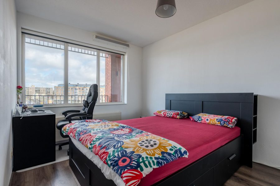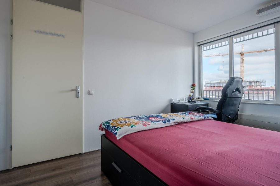 The spacious and bright living room has windows at the front and doors opening to a nice balcony with unobstructed views over a playful Zaan area. Here you can create a nice lounge area. The living room is large enough to accommodate a spacious seating area and a six-person dining table. At the back of the living room you will find the straight kitchen with various built-in appliances. The apartment has a barrier-free wooden floor and the walls and ceilings are finished neatly and neutral.