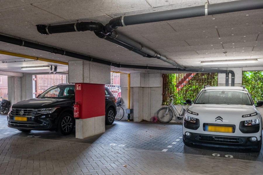 Je hebt een eigen parkeerplek in de parkeerkelder en er is parkeerruimte rond het complex.