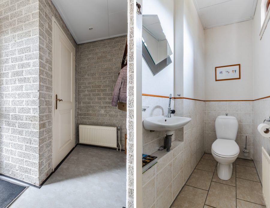 Achter de voordeur bevindt zich een kleine entreehal met meterkast, een toiletruimte met staand toilet en fonteintje, en toegang tot een andere hal. Vanuit de tweede hal bereik je de woonkamer en de trap naar de eerste verdieping.