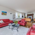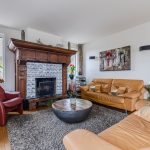 The spacious living room has neat flooring and sleek walls. Thanks to the presence of several large windows and sliding doors, there is plenty of natural light. The cozy fireplace with classic mantelpiece makes the room extra cozy.
