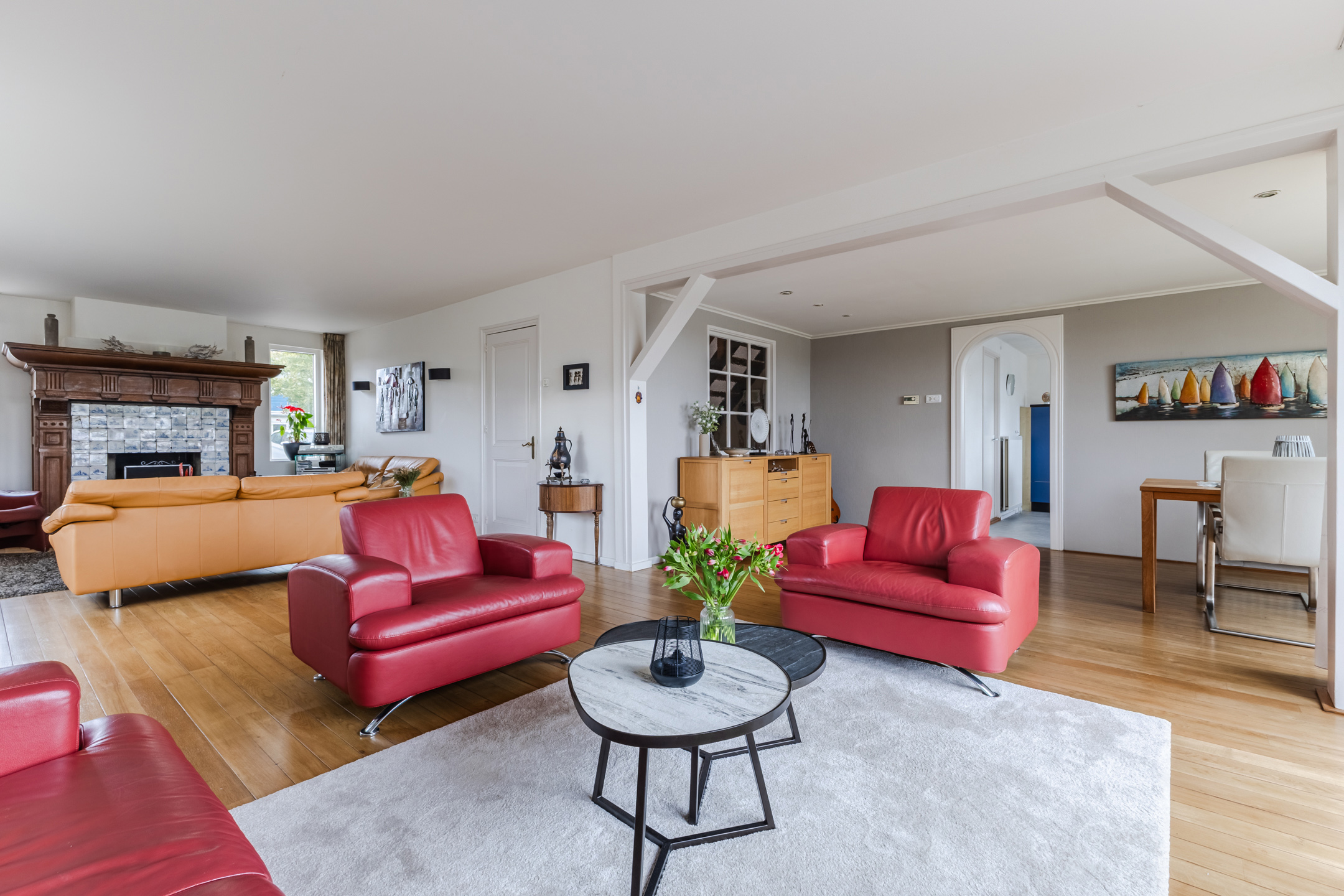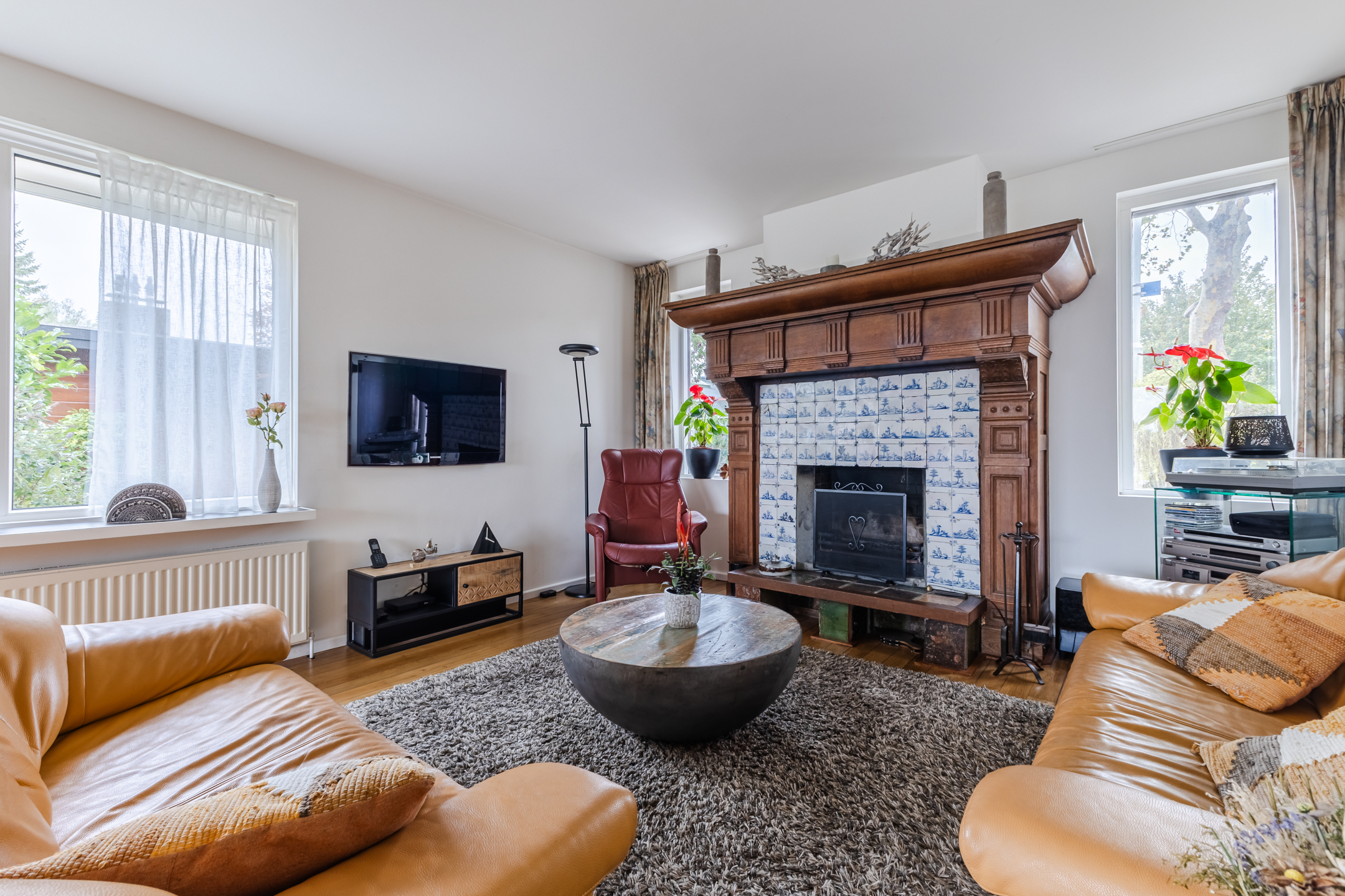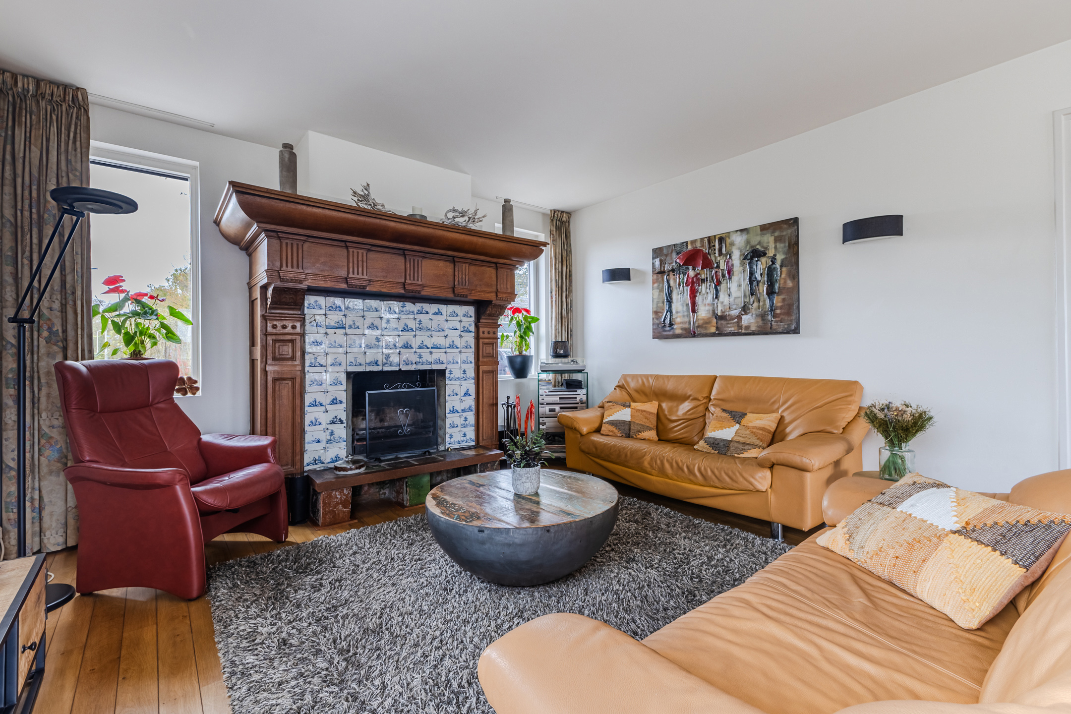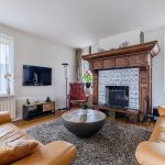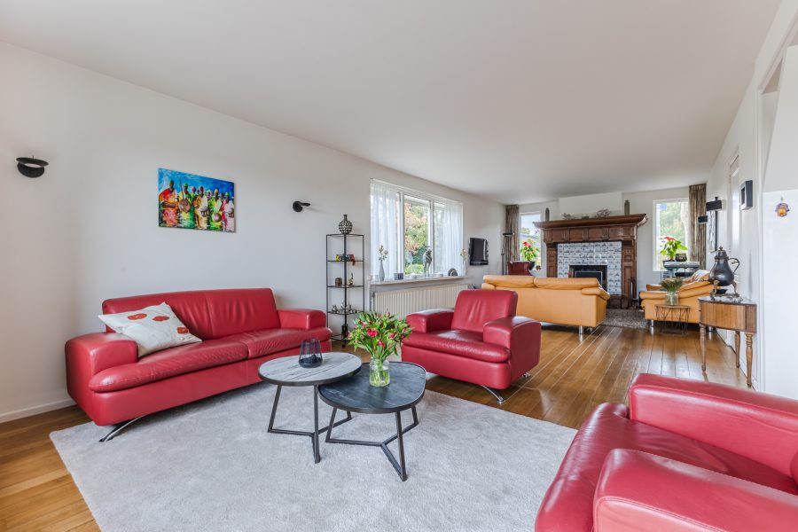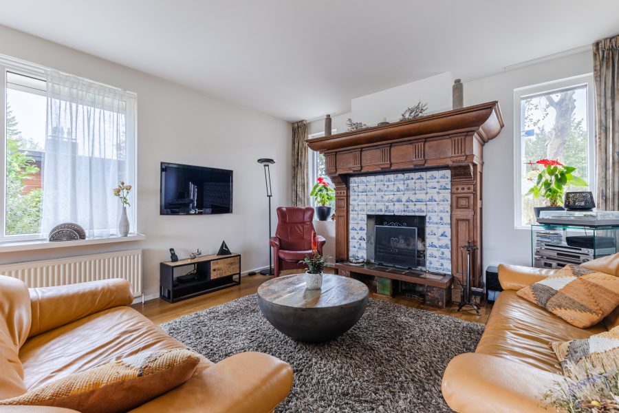 In de royale woonkamer ligt een nette vloer en zijn de wanden strak afgewerkt. Dankzij de aanwezigheid van meerdere grote ramen en de schuifpui valt er veel natuurlijk licht binnen. De sfeervolle open haard met klassieke schouw maakt de ruimte extra gezellig.