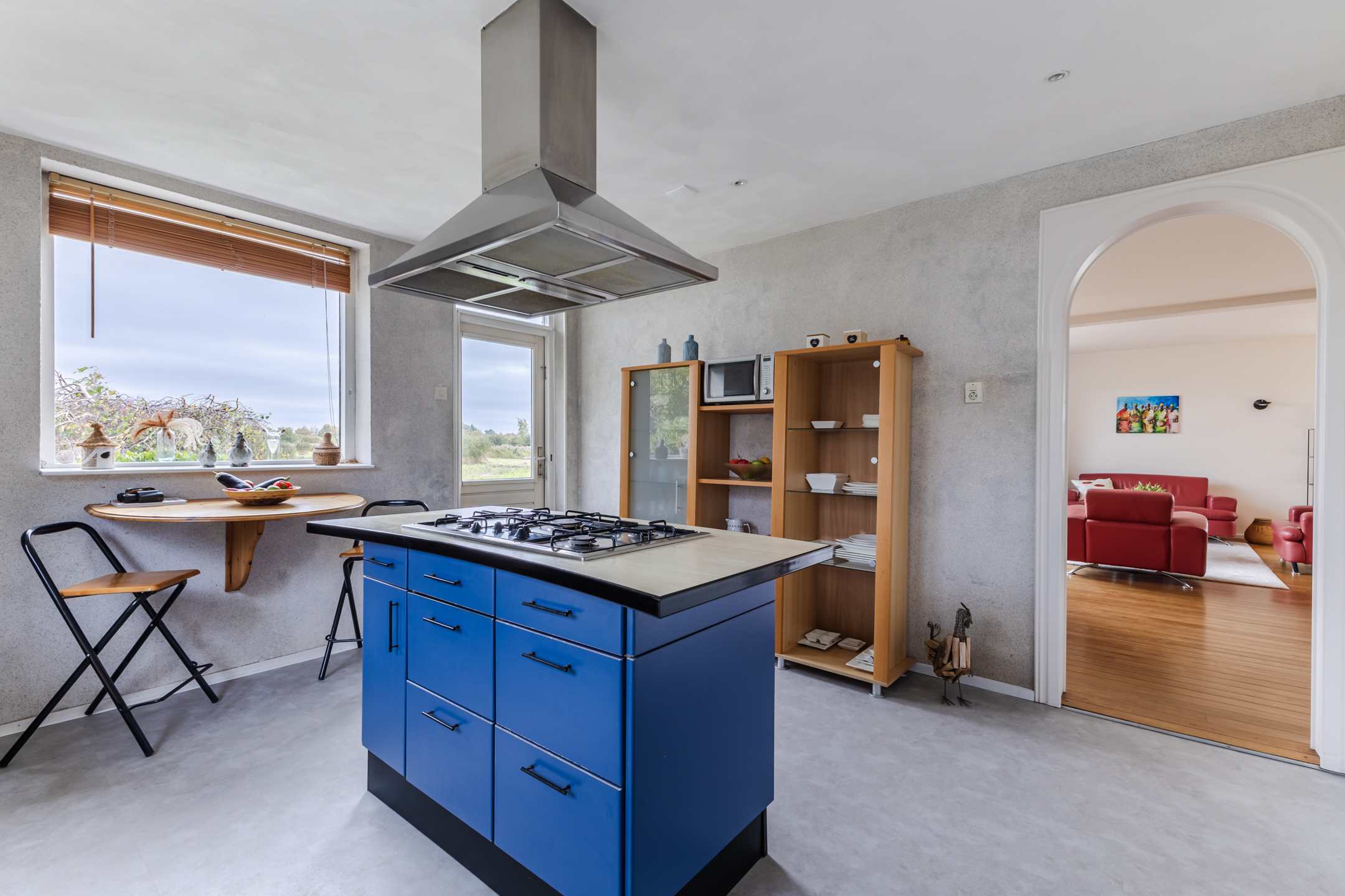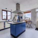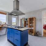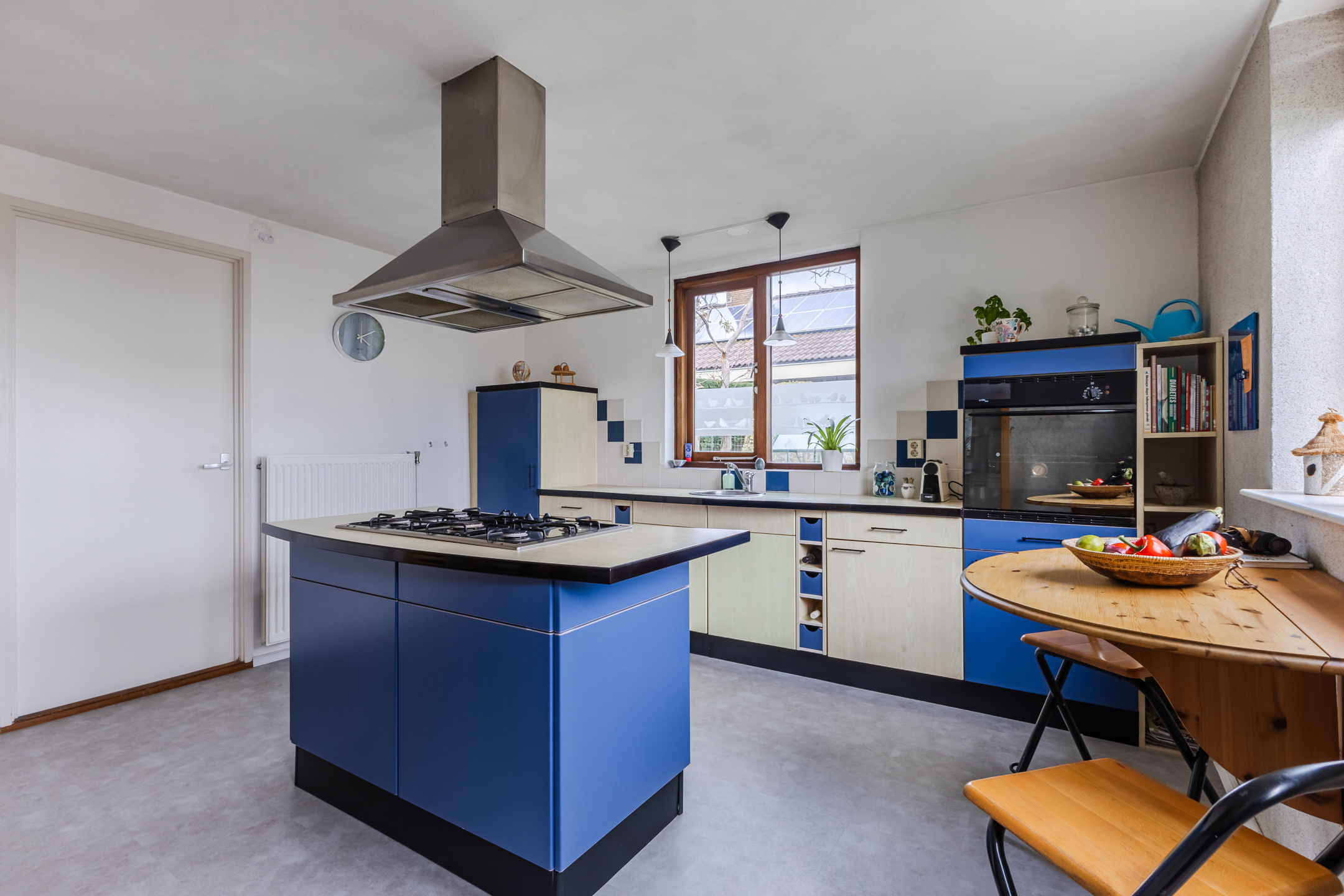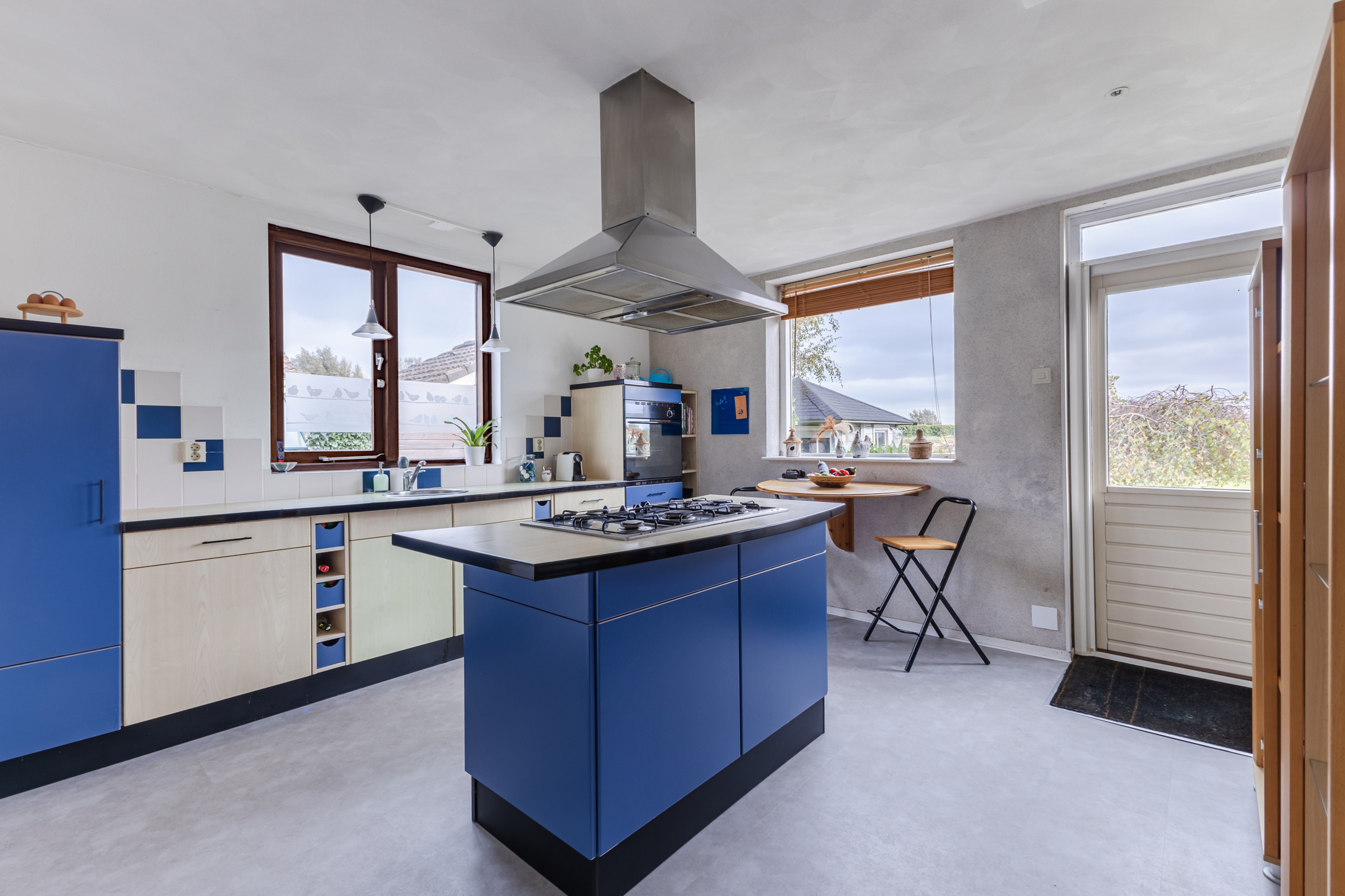 Through the living room you can reach the kitchen. This spacious kitchen consists of two kitchen units and has a colorful design with blue and white cabinets. Here you will find the following appliances: 5-burner gas stove, extractor hood, dishwasher, refrigerator (2025) and oven. The kitchen benefits from plenty of natural light and is further illuminated by recessed spotlights. From here you have access to the backyard.