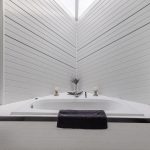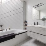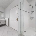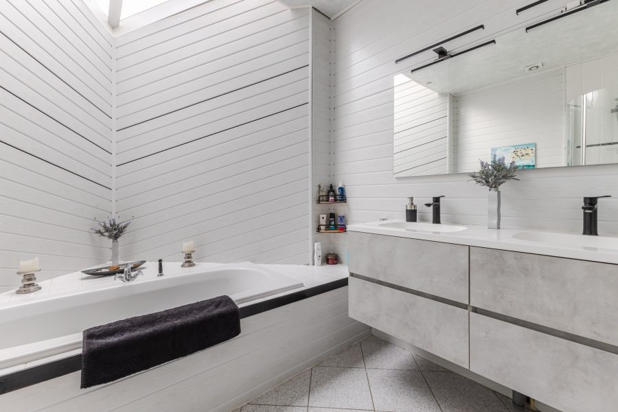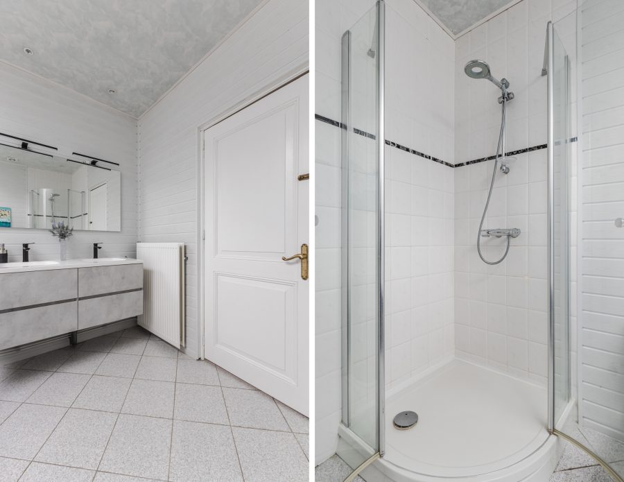 De royale en nette badkamer is in lichte kleuren betegeld. Hier vind je een staand toilet, badmeubel met dubbele wastafel (2023), ligbad en douchecabine.