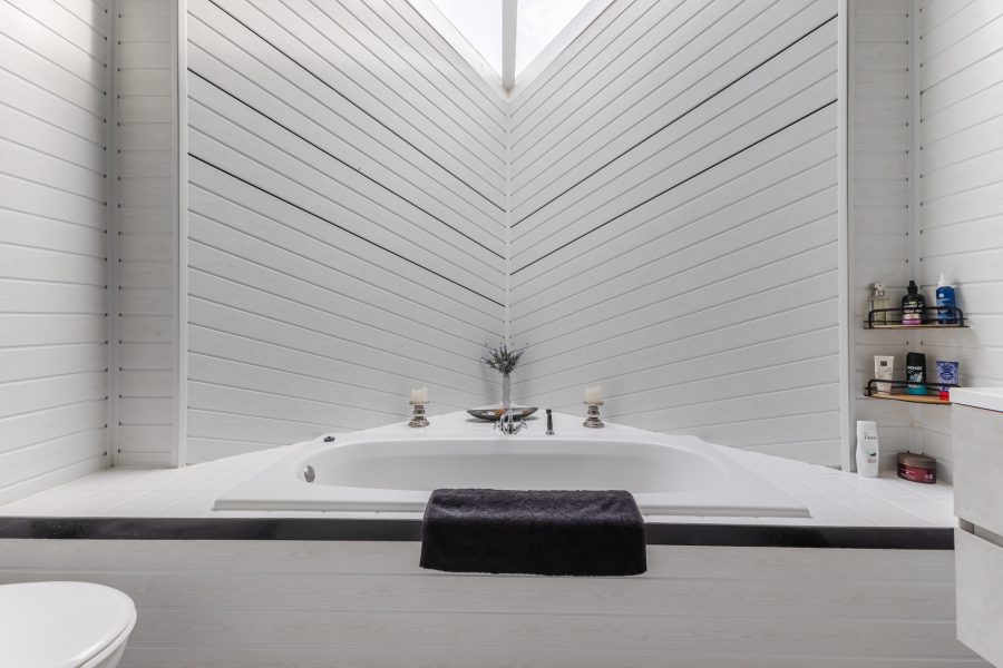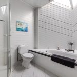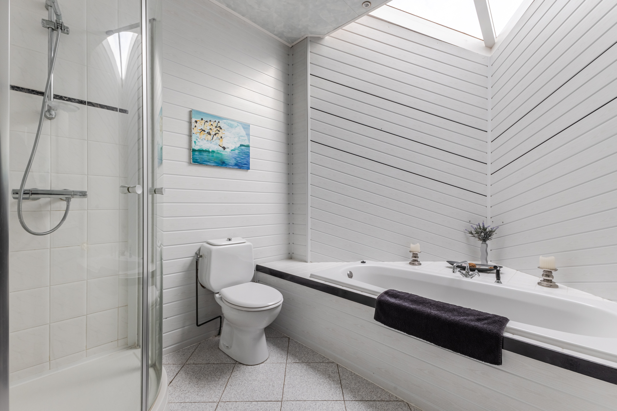 • Large bathroom with toilet, sink, bathtub and shower cabin