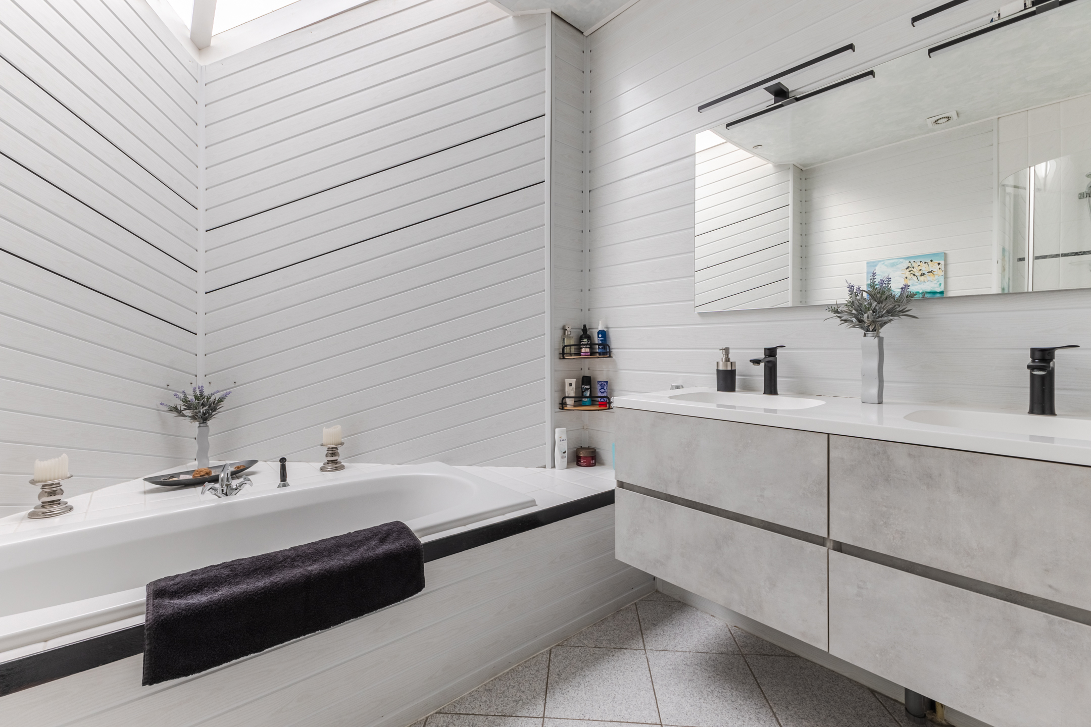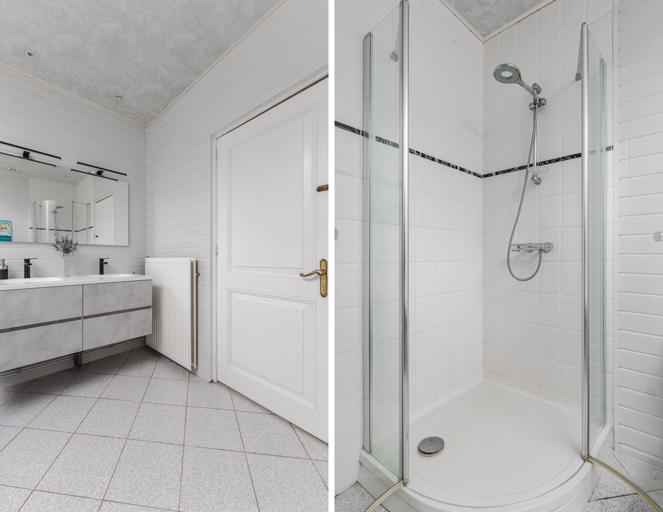 The spacious and neat bathroom is tiled in light colors. Here you will find a standing toilet, vanity with double sink (2023), bathtub and shower cabin.