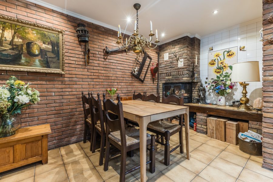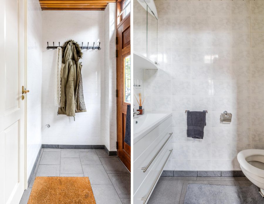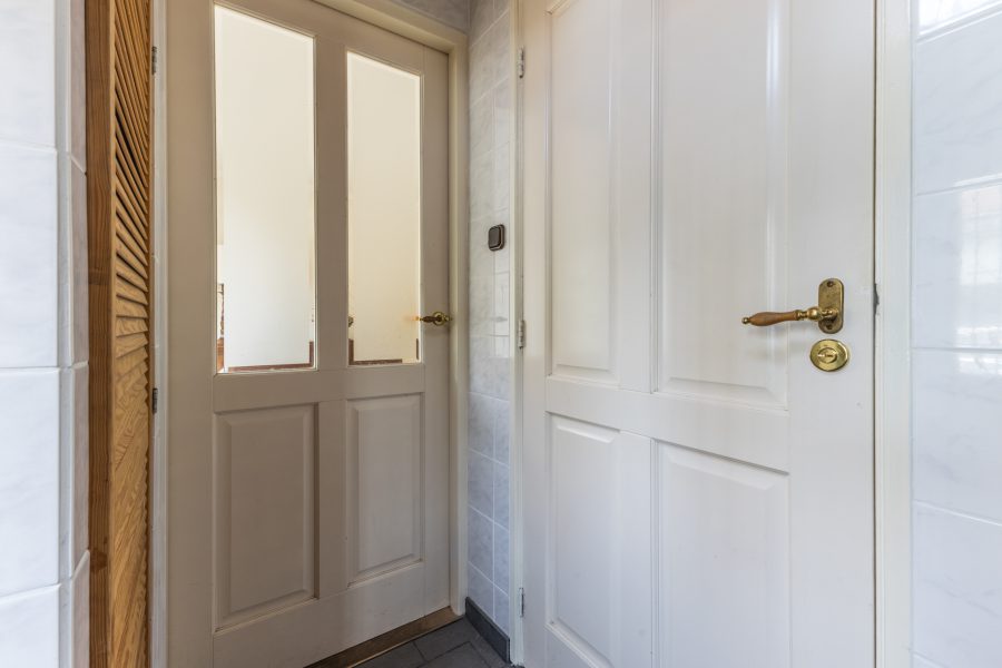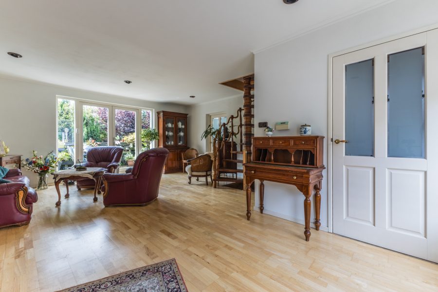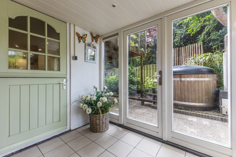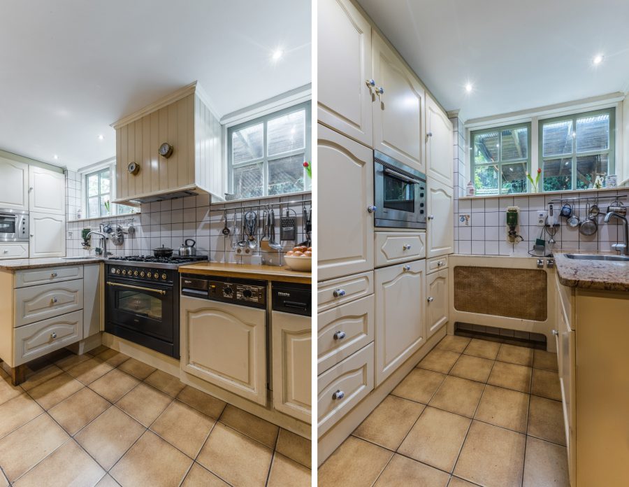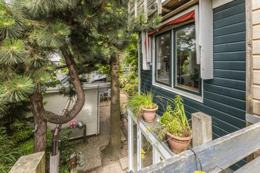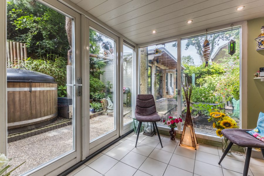 Through the beautiful wooden staircase, we reach the spacious living kitchen. The kitchen has a cosy fireplace and a beautiful, very spacious, well-equipped kitchen with built-in appliances. Through the kitchen you reach a bright hallway with many windows and views of the green, mature garden. Through this hallway, the fully equipped sauna is accessible. There are two more storage rooms in the garden, ideal as a hobby room. Attached to the kitchen is a covered terrace, where you can enjoy your meals outside during the summer months. You can also relax here in the hot tub. You have maximum privacy here! This part of the house and garden can be accessed by stairs from the embankment.
