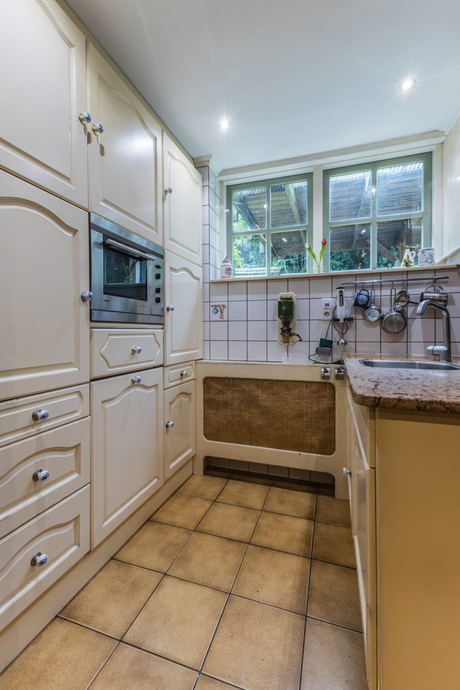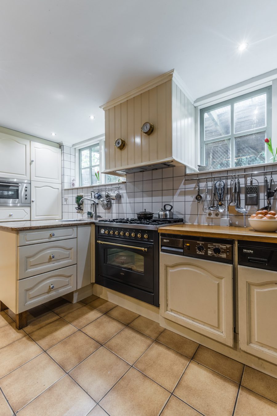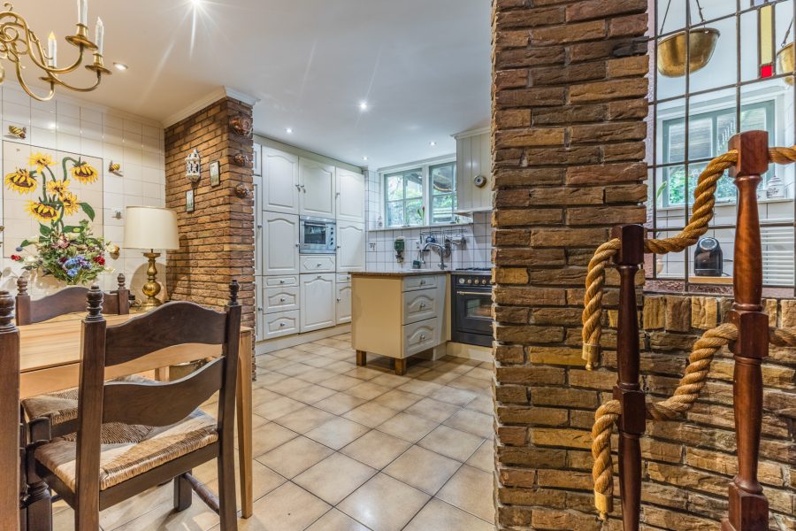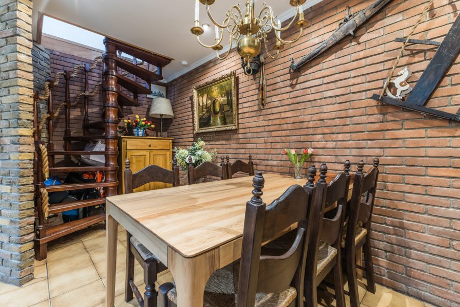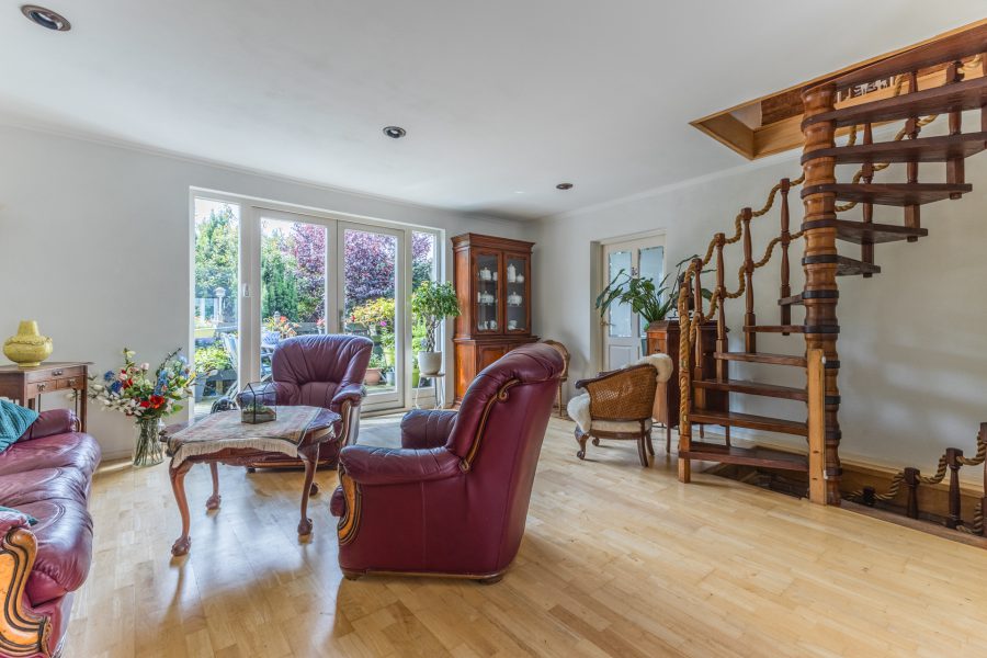 Through the beautiful wooden staircase, we reach the spacious living kitchen. The kitchen has a cosy fireplace and a beautiful, very spacious, well-equipped kitchen with built-in appliances. Through the kitchen you reach a bright hallway with many windows and views of the green, mature garden. Through this hallway, the fully equipped sauna is accessible. There are two more storage rooms in the garden, ideal as a hobby room. Attached to the kitchen is a covered terrace, where you can enjoy your meals outside during the summer months. You can also relax here in the hot tub. You have maximum privacy here! This part of the house and garden can be accessed by stairs from the embankment.