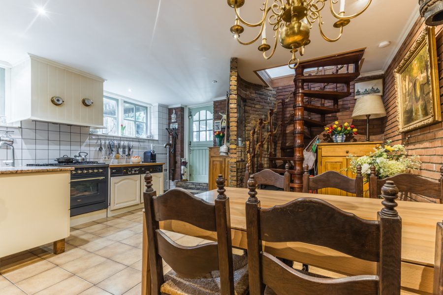 Via de fraaie houten trap bereiken we de zeer ruime woonkeuken. De verdieping is voorzien van een houtkachel en een fraaie, zeer ruime, goed geoutilleerde keuken. Ook is het hier comfortabel warm door de vloerverwarming. Via de woonkeuken bereik je de lichte tuinkamer met openslaande deuren en veel raampartijen en zicht op de groene, volgroeide tuin. Via deze tuinkamer is de compleet ingerichte, professionele, sauna/Turks stoombad bereikbaar. In de tuin staat een tuinhuis en nog een werkplaats, ideaal als hobbyruimte. Aan de keuken vast tref je een overdekt terras aan, waar je gezellig buiten kunt eten in de zomermaanden. Ook kun je hier relaxen in de hot tub. Je hebt hier optimale privacy! Dit gedeelte van de woning en de tuin is vanaf de dijk met een trap bereikbaar.