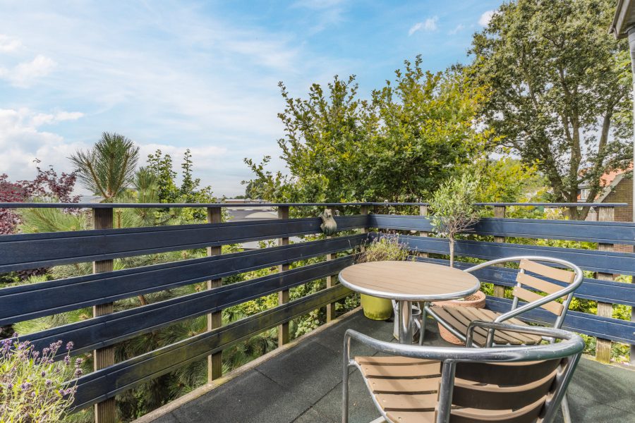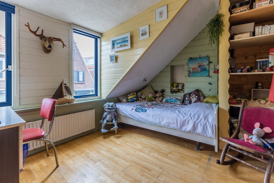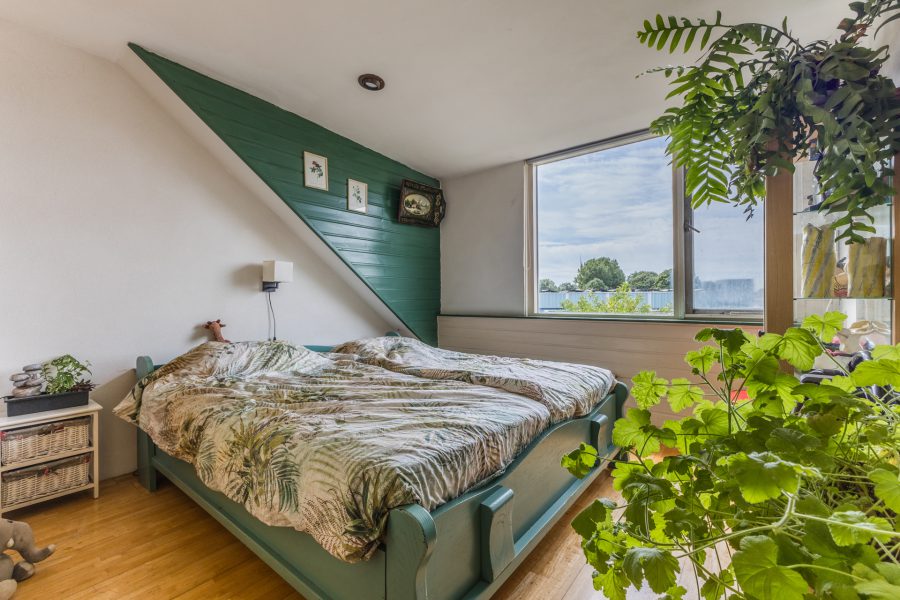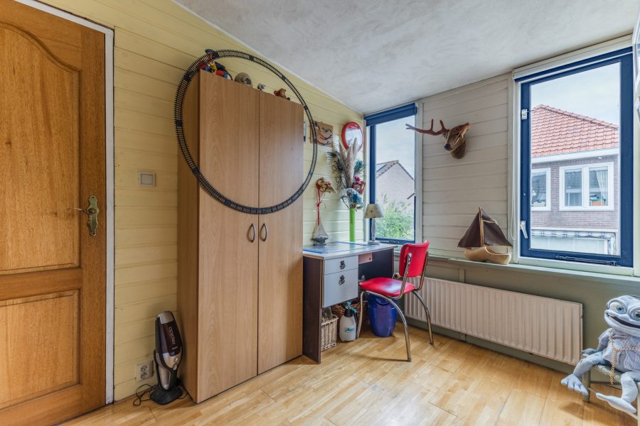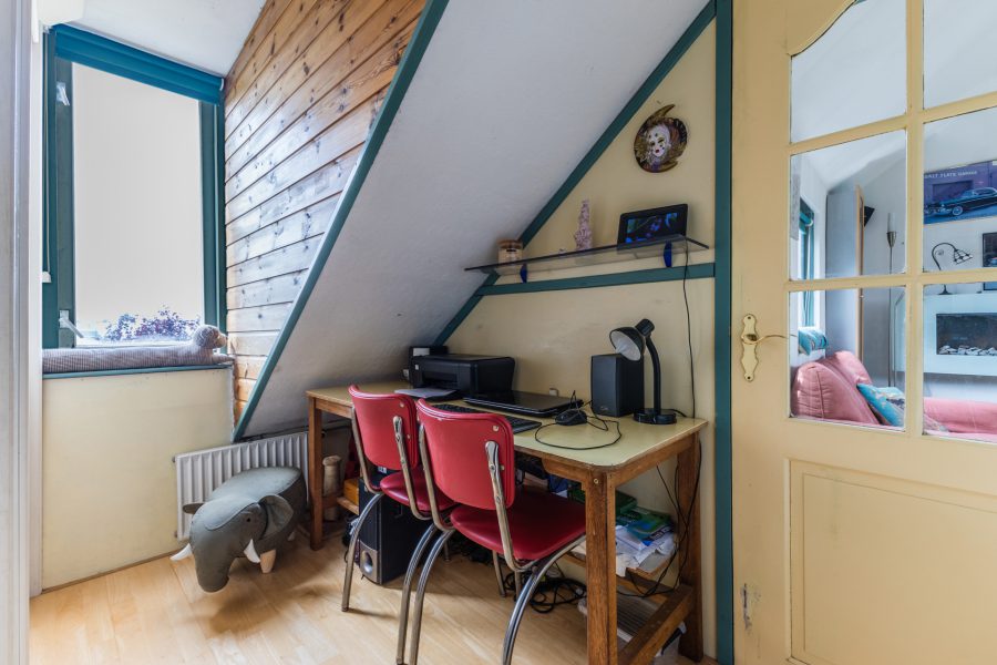 Via de open houten trap in de woonkamer bereik je de overloop van deze verdieping. Hier tref je drie slaapkamers aan, een werkkamer en de badkamer. De verdieping is zowel voor als achter voorzien van dakkapellen. Twee van deze kamers hebben vaste kasten en de hoofdslaapkamer heeft toegang tot een dakterras. In de badkamer zijn een wastafel met spiegel, een douchecabine en een ligbad te vinden.