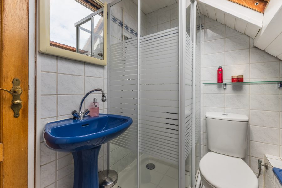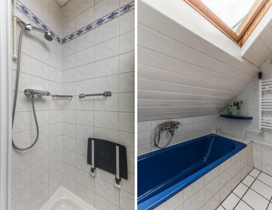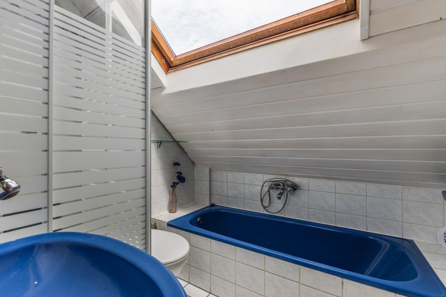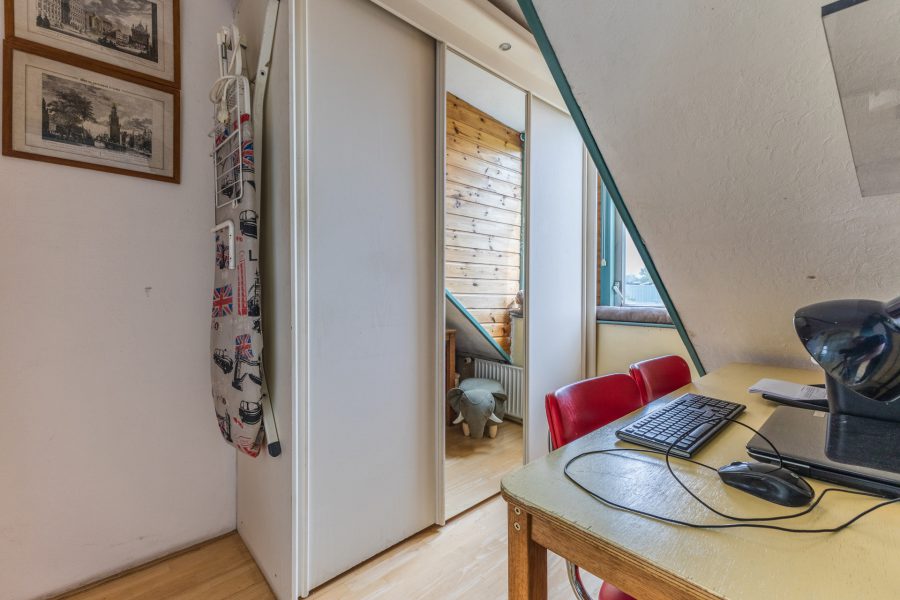 Via the open wooden staircase in the living room, you reach the landing of this floor. Here you will find three bedrooms, a study and the bathroom. The floor is fitted with dormer windows both at the front and the back. The largest room at the back has closets and the master bedroom has access to a roof terrace. The bathroom has a washbasin with mirror, a shower cubicle and a bathtub.