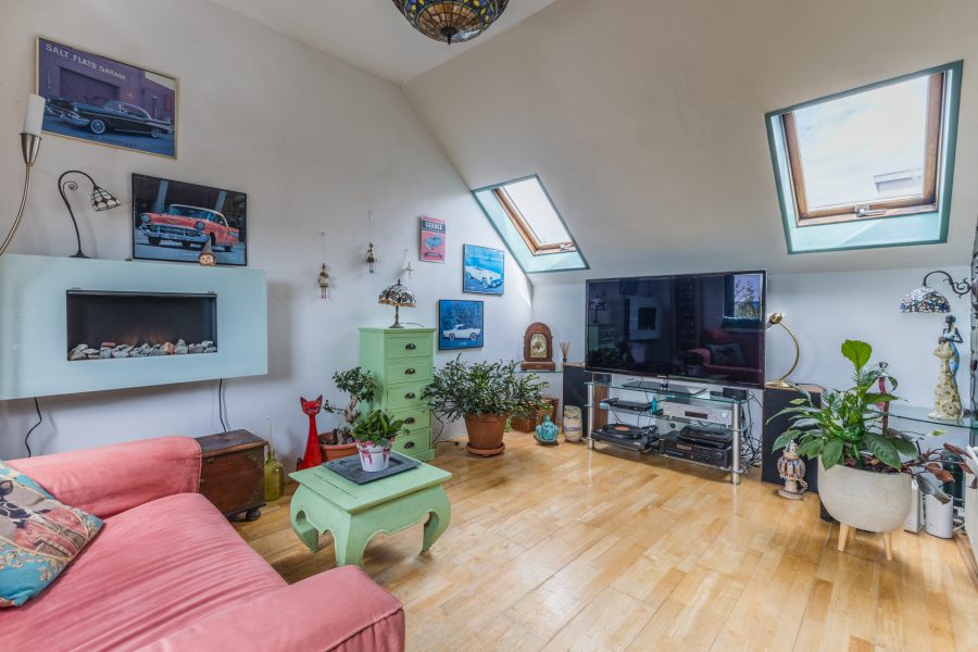 Via de betegelde voortuin bereiken we de voordeur. Entree met vernieuwde meterkast en garderobe. Hier zit een luik met 11m2 opslagruimte. Een zwevend toilet met wasbak en toegang tot de ruime, lichte woonkamer met aansluitend de slaapkamer/kantoor en de berging. De sfeervolle woonkamer heeft aan de voorzijde twee raampartijen en aan de achterzijde openslaande deuren naar een groot dakterras gelegen op het zonnige zuidwesten met een fijne loungeplek. In de kamer is de trap naar de benedenverdieping te vinden. De berging is zowel inpandig als van buitenaf te bereiken en daarmee ideaal om je fietsen te plaatsen.