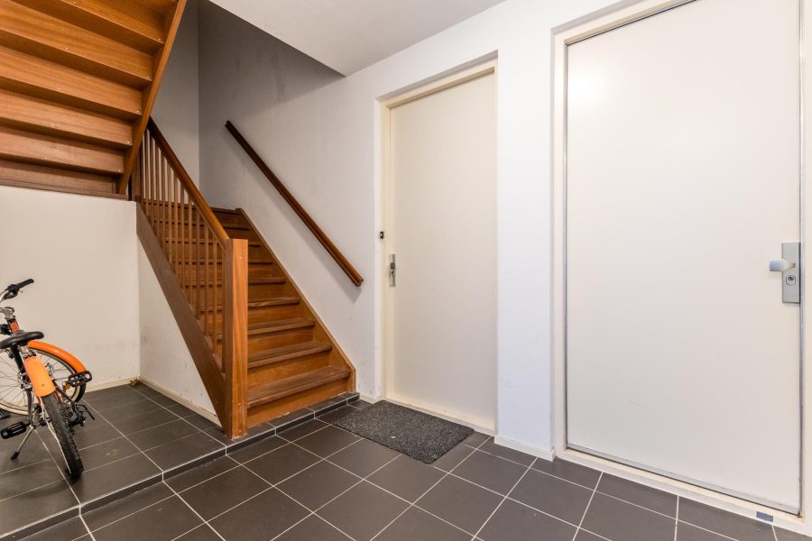Gesloten entree met bel en intercom. Gezamenlijke hal met trappenhuis.
