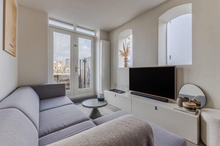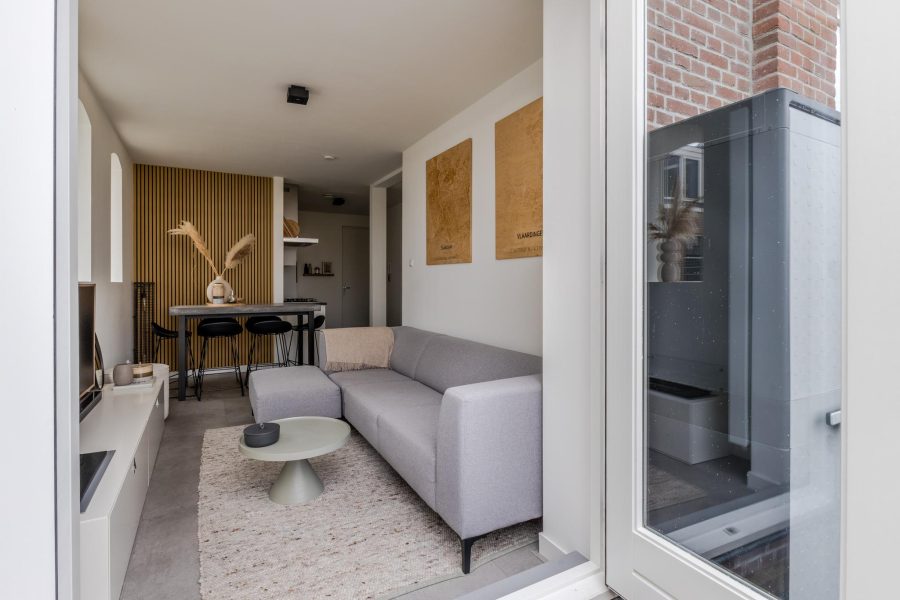 Terug in de keuken heb je een open verbinding met de woonkamer. De woonkamer heeft aan de voorzijde openslaande deuren naar de tuin en opzij drie karakteristieke ramen. Hier is plaats voor een zithoek en een eettafel. Via de woonkamer bereik je de afgesloten kast met de wasmachine en de slaapkamer met uitzicht op de tuin. Op de vloer van het appartement liggen tegels en de muren en plafonds zijn strak afgewerkt.