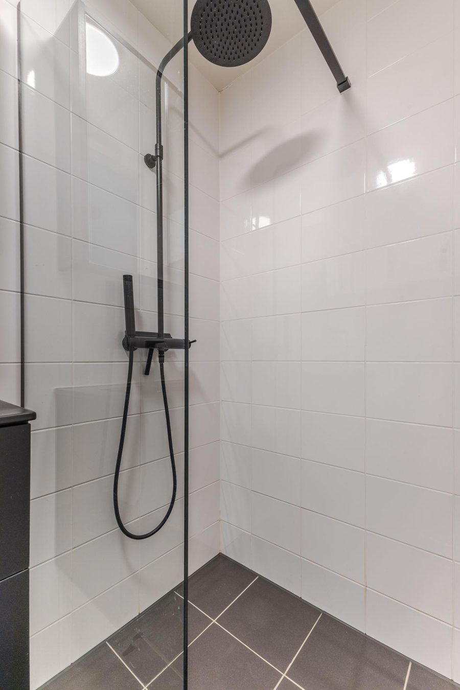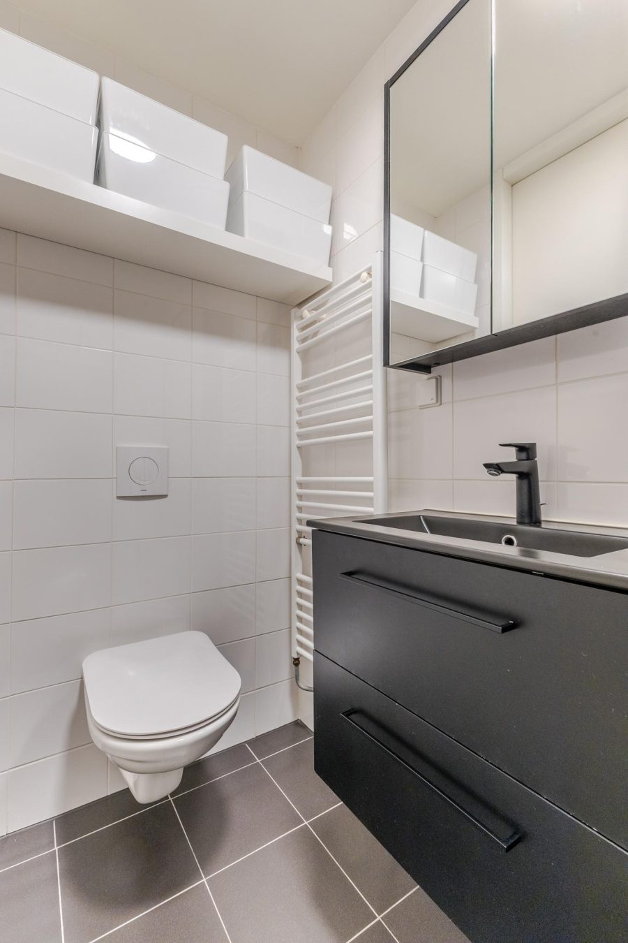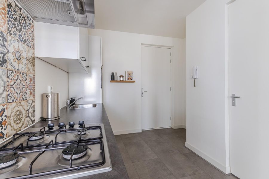Via de gezamenlijke hal bereiken we de voordeur van de woning gelegen op de begane grond. Entree met bergkast. Je komt ter hoogte van de keuken binnen. Moderne, rechte keuken. De keuken heeft witte fronten en is voorzien van diverse inbouwapparatuur. Tegenover de keuken tref je de eigentijdse badkamer aan. In de badkamer zijn een zwevend toilet, een designradiator, een badmeubel met wastafel en spiegelkast en een inloopdouche te vinden.