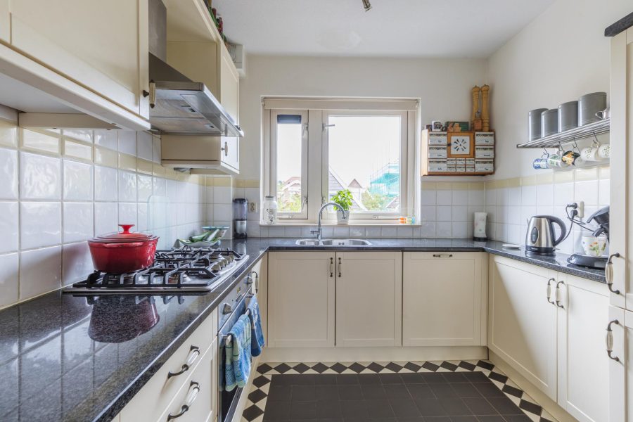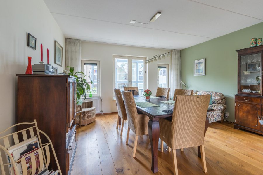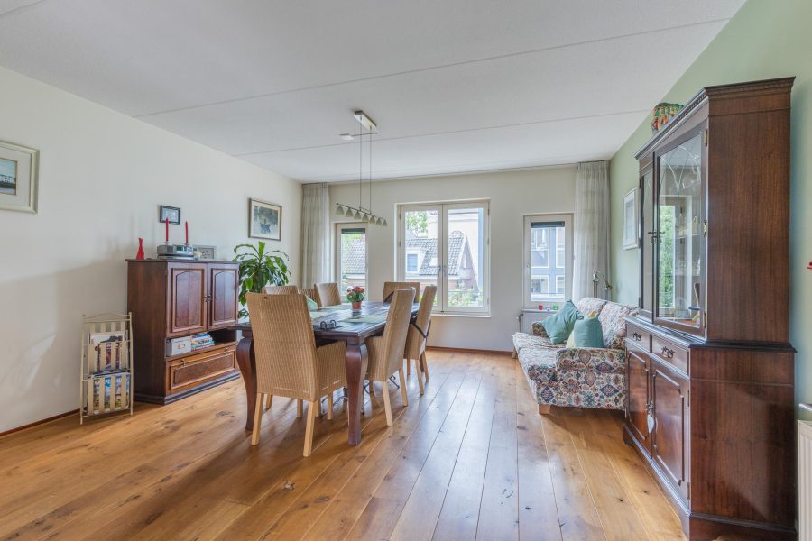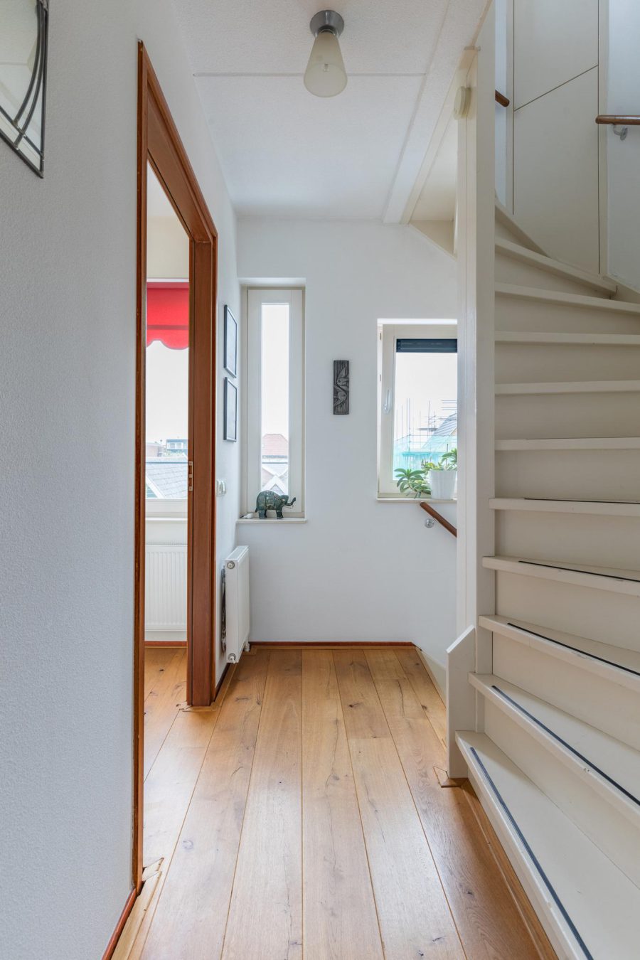 Via de trap bereik je de overloop. De overloop heeft een toegangsdeur naar een ruim dakterras waar je een fijne loungeplek kunt realiseren. Ook de toegangsdeur tot de lichte woonkamer met open keuken tref je hier aan. De woonkamer heeft aan de voorzijde drie raampartijen, aan de achterzijde is de U-vormige keuken gesitueerd. De keuken heeft crème witte fronten en is voorzien van diverse inbouwapparatuur. Vanuit de keuken heb je via een raam zicht op de tuin beneden. Op deze verdieping liggen mooie houten vloerdelen.