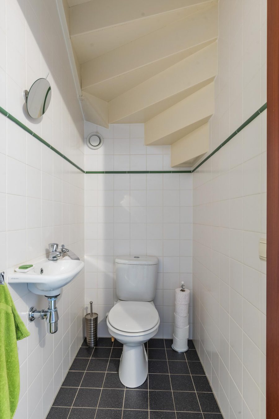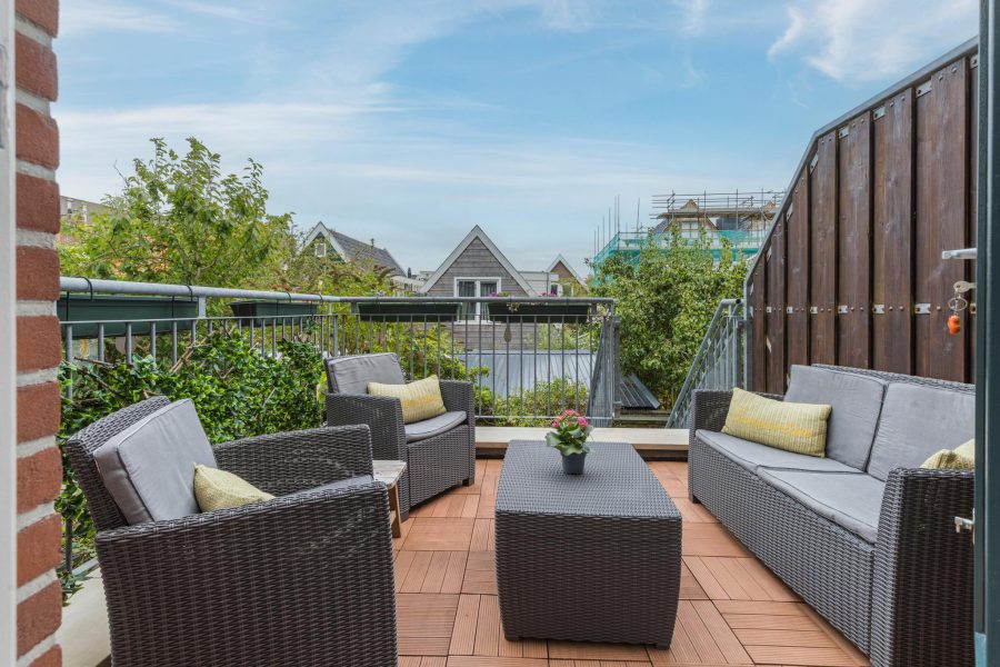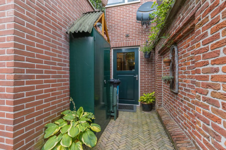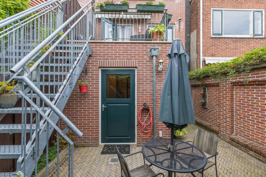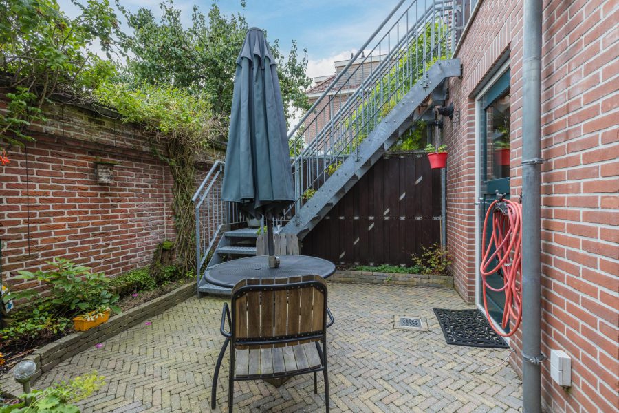 The property has a paved and largely walled garden on the ground floor. The attractive garden has a border with perennials and shrubs. You have optimum privacy here and the possibility of creating a nice lounge area. A high iron staircase in the garden leads to the first floor balcony. From the garden and from the first floor, the house and garden are accessible, respectively.