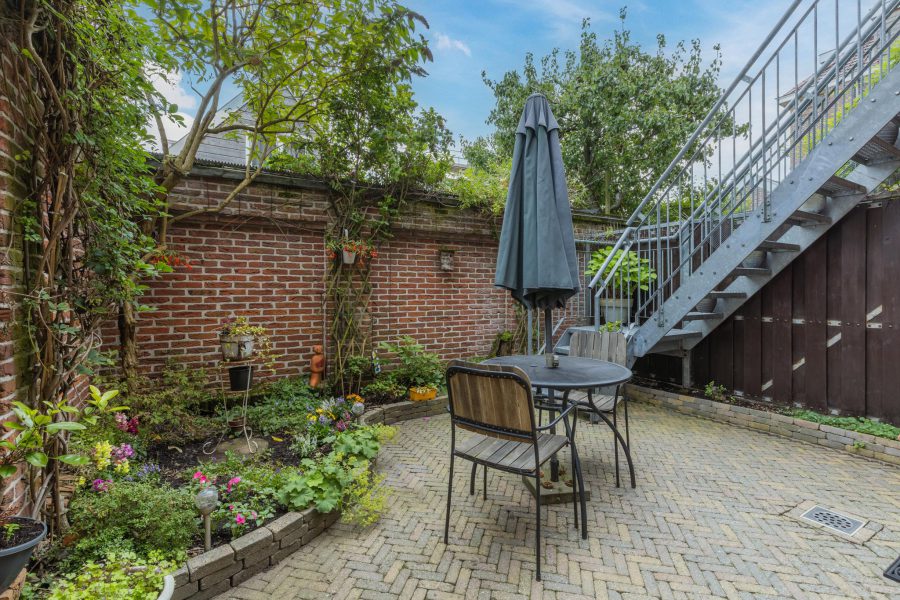 De woning heeft op de begane grond een bestrate en grotendeels ommuurde tuin. De sfeervolle tuin heeft een border met vaste planten en heesters. Je hebt hier optimale privacy en de mogelijkheid om een fijne loungeplek te realiseren. In de tuin staat een hoge ijzeren trap die naar het dakterras van de eerste verdieping leidt. Vanaf de tuin en vanaf de eerste verdieping zijn respectievelijk het huis en de tuin bereikbaar