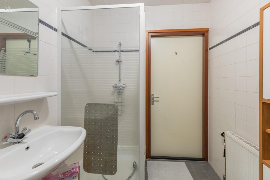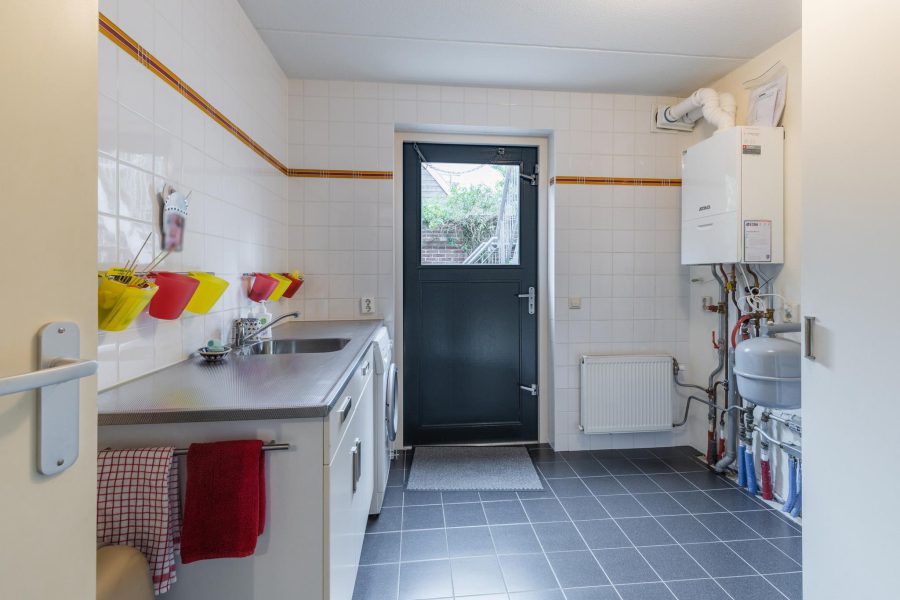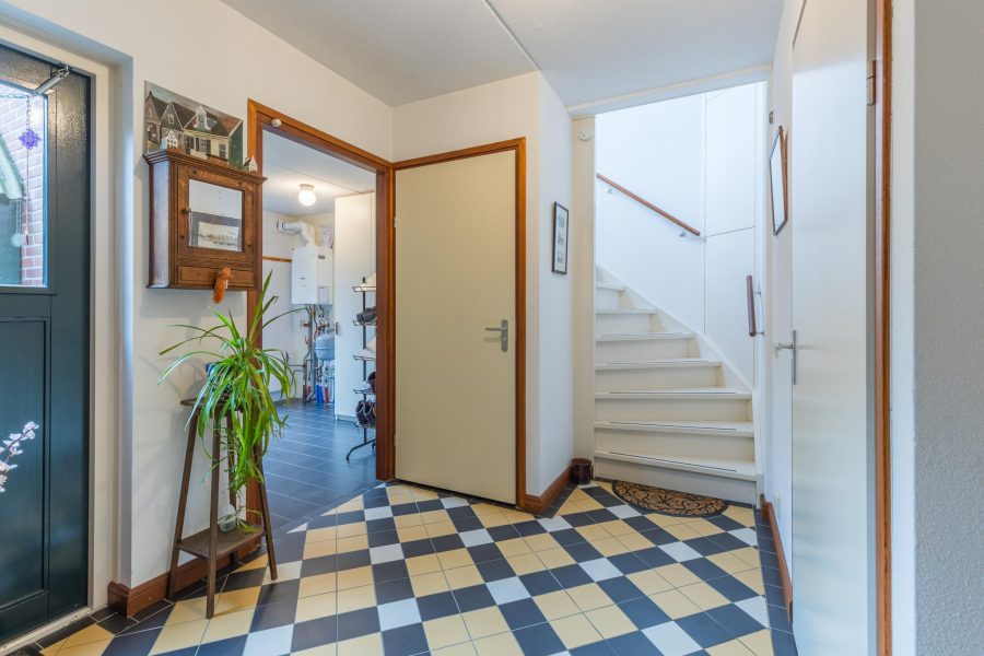 Via de stoep bereiken we de voordeur van de woning. Ruime gang/hal met garderobe, meterkast, trapopgang naar de eerste verdieping, staand toilet met fonteintje en toegang tot de ruime bijkeuken. Je kunt de woning ook via de inpandige garage binnengaan. De bijkeuken is voorzien van een keukenblok, bergruimte en ook de aansluitingen voor het witgoed en de cv-installatie tref je hier aan. Zowel de hal als de bijkeuken hebben een toegang tot de ommuurde tuin.