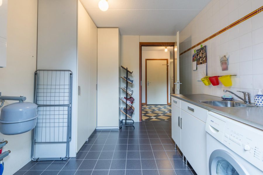 Via the pavement we reach the front door of the house. Spacious hallway with cloakroom, meter closet, staircase to the first floor, standing toilet with hand basin and access to the spacious utility room. You can also enter the house via the indoor garage. The scullery is equipped with a kitchen unit, storage space and also the connections for washer and dryer and the central heating system. Both the hallway and the utility room have access to the walled garden.