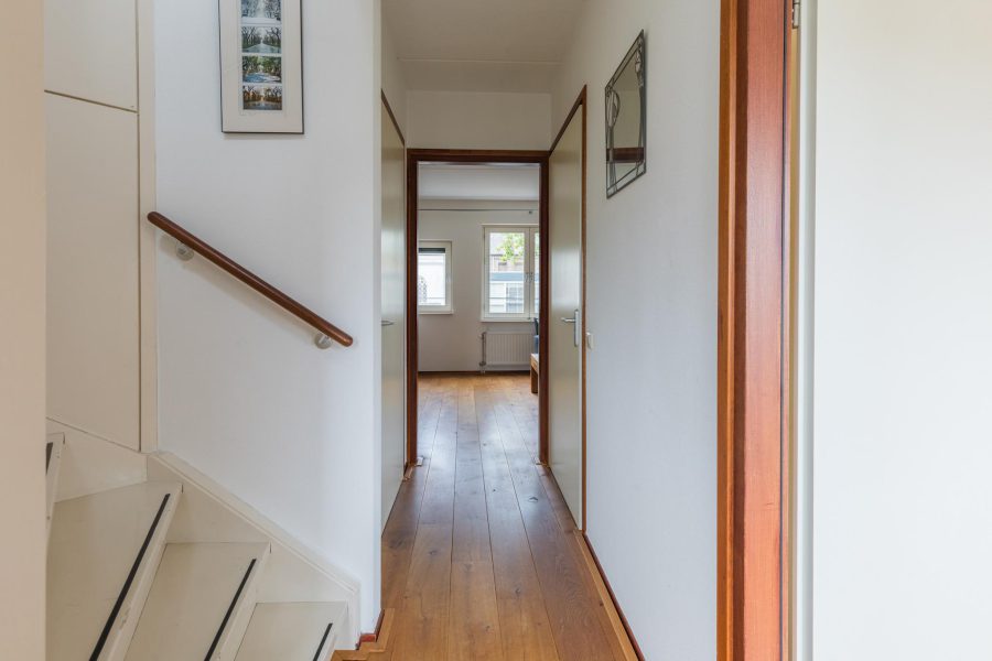 Via de overloop zijn twee slaapkamers, een separaat toilet en de badkamer bereikbaar. De grootste slaapkamer ligt aan de voorzijde en een kleinere aan de achterzijde. De badkamer en het separate zwevende toilet met fonteintje liggen centraal op de verdieping. De badkamer is voorzien van een badmeubel met wastafel en spiegel, een inloopdouche en een ligbad. Ook deze verdieping is keurig afgewerkt en heeft een mooie lichtinval.