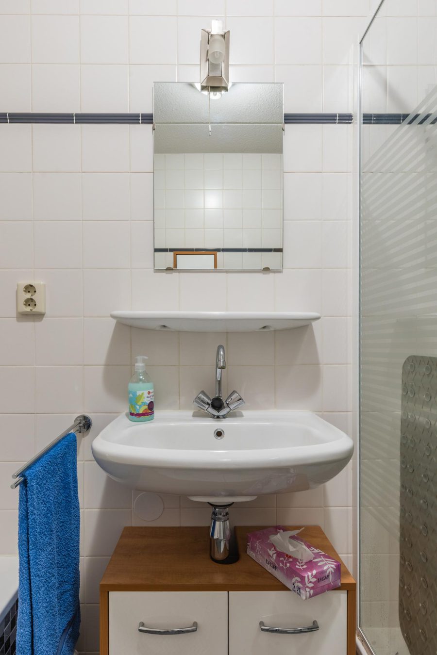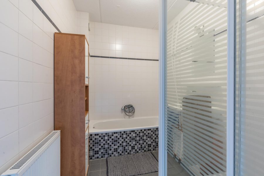 Through the landing, two bedrooms, a separate toilet and the bathroom are accessible. The largest bedroom is at the front and a smaller one at the back. The bathroom and separate floating toilet with hand basin are located centrally on the floor. The bathroom has a vanity unit with sink and mirror, a walk-in shower and a bathtub. This floor is also nicely finished and has a nice light.
