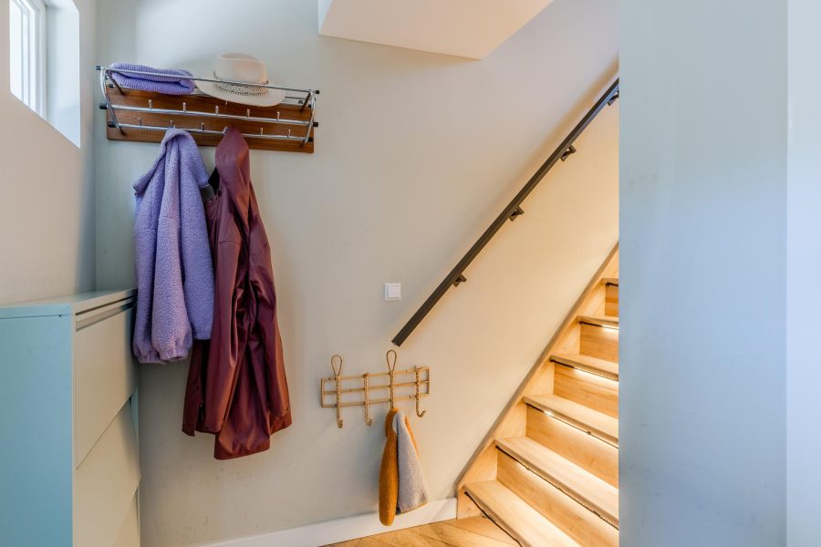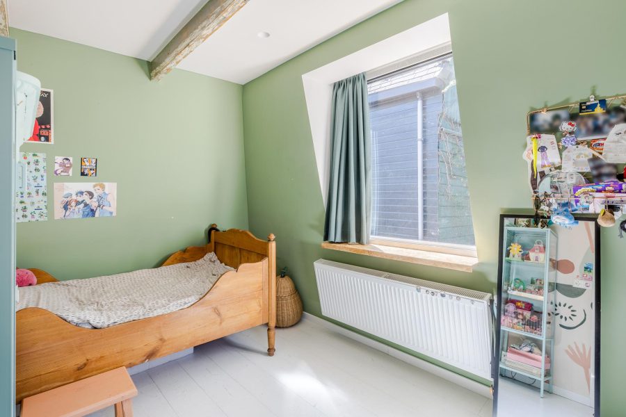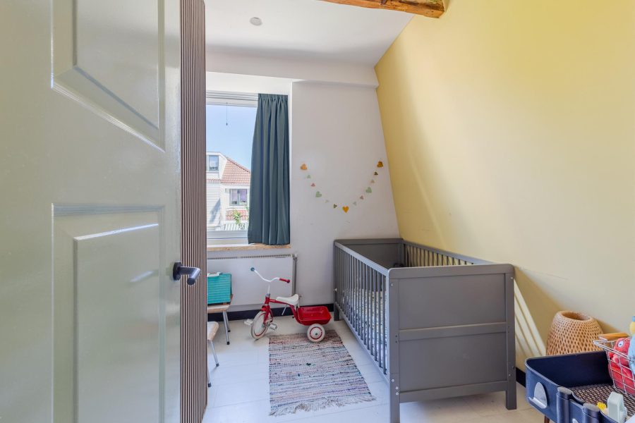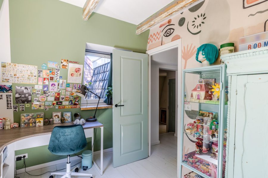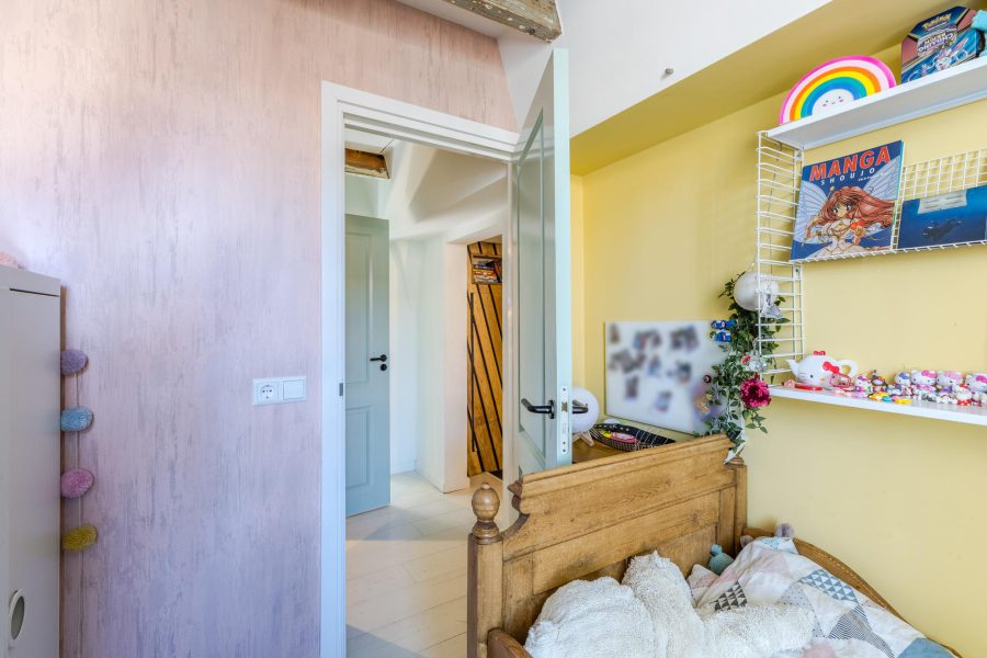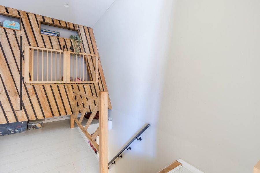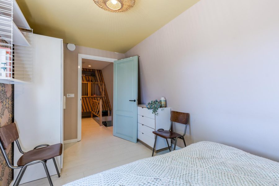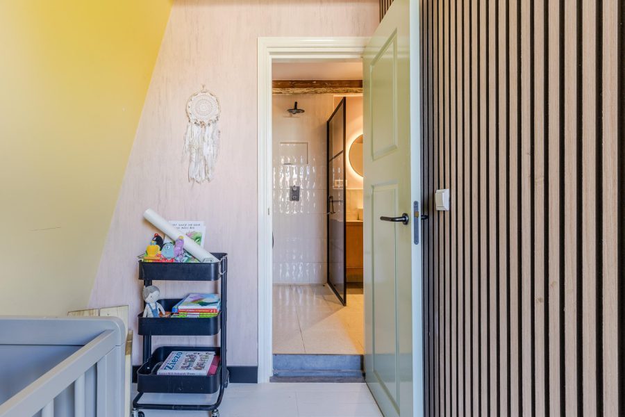 The staircase with illuminated steps takes us to the landing of this floor. Here you will find four bedrooms, a separate floating toilet and the bathroom. The floor has been extended with several smaller dormers. Via the landing, the bedroom on the extension can be found. You will also find a hallway with access to the three other bedrooms and the bathroom. From two bedrooms you can easily make one bedroom. The contemporary bathroom comprises a vanity unit with washbasin, a freestanding bathtub and a walk-in shower with handheld and rain shower. The bathroom has underfloor heating. All bedrooms are nicely finished and have plenty of light. On the landing, you will find a hatch to the storage attic.